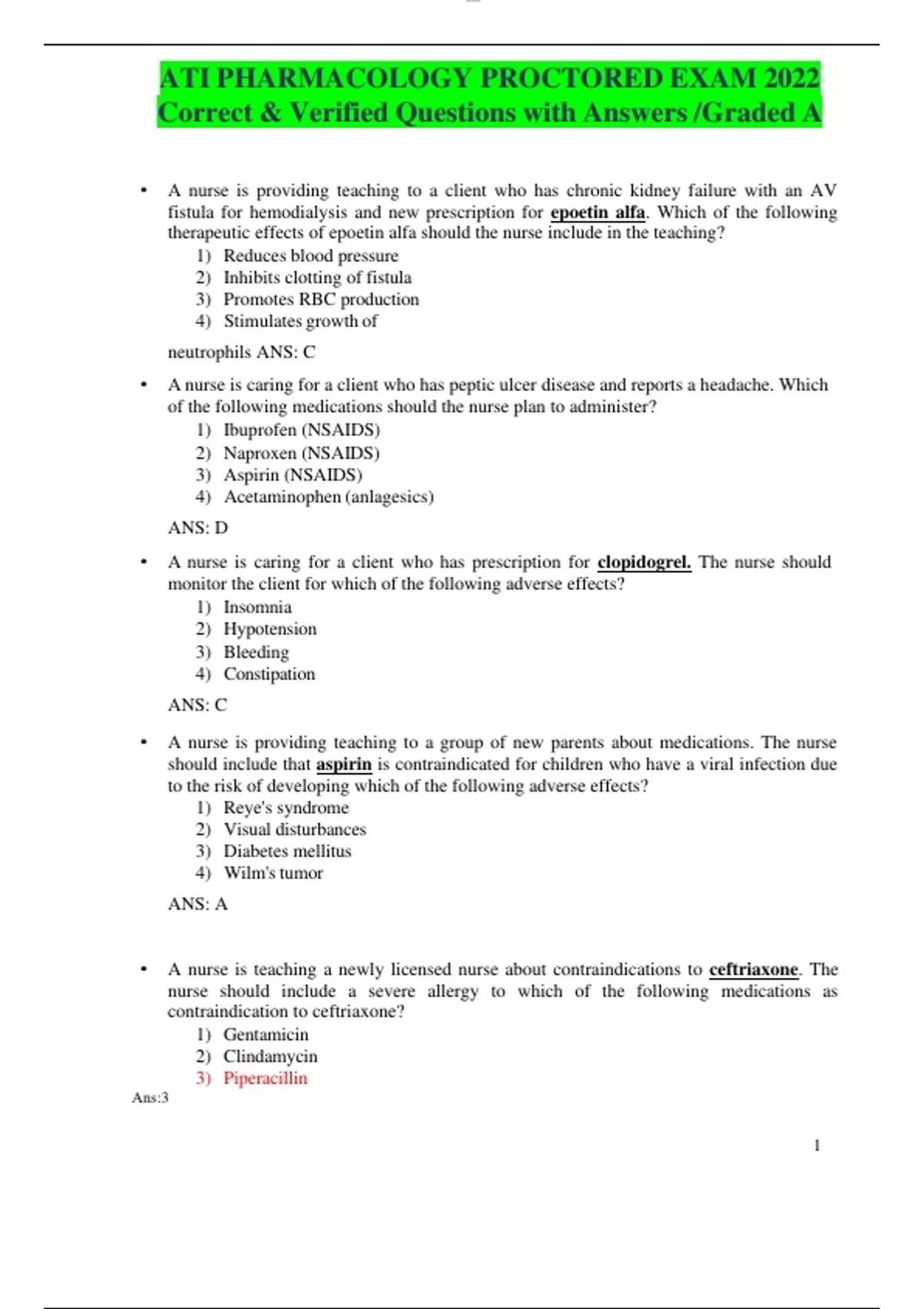 ATI PHARMACOLOGY PROCTORED EXAM 2022 Correct & Verified Questions with Answers /Graded A