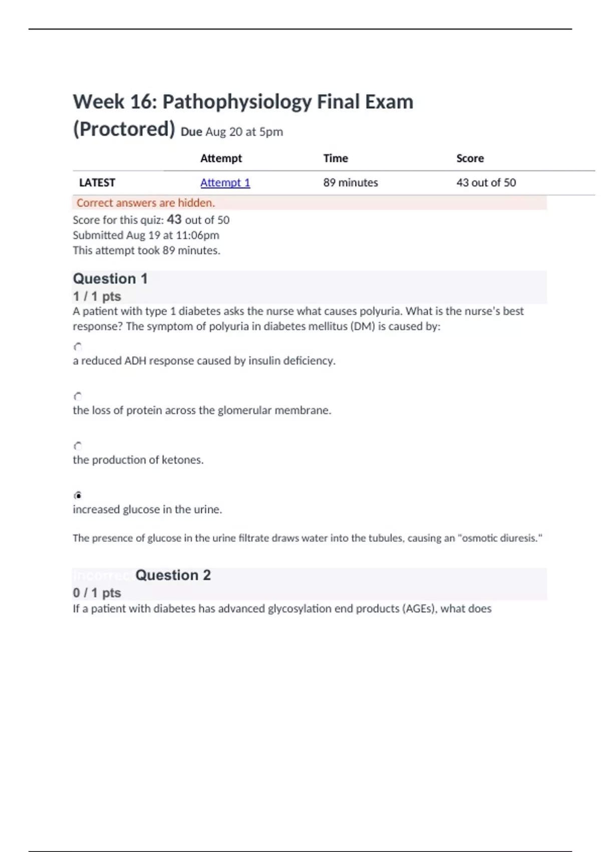 Week 16: Pathophysiology Final Exam (Proctored) Due Aug 20 at 5pm Attempt Time Score LATEST Attempt 1 89 minutes 43 out of 50 Correct answers are hidden. Score for this quiz: 43 out of 50 Submitted Aug 19 at 11:06pm This attempt took 89 minutes. Question 1 1 / 1 pts A patient with type 1 diabetes asks the nurse what causes polyuria. What is the nurse’s best response? The symptom of polyuria in diabetes mellitus (DM) is caused by: a reduced ADH response caused by insulin deficiency. the loss of protein across the glomerular membrane. the production of ketones. increased glucose in the urine. The presence of glucose in the urine filtrate draws water into the tubules, causing an