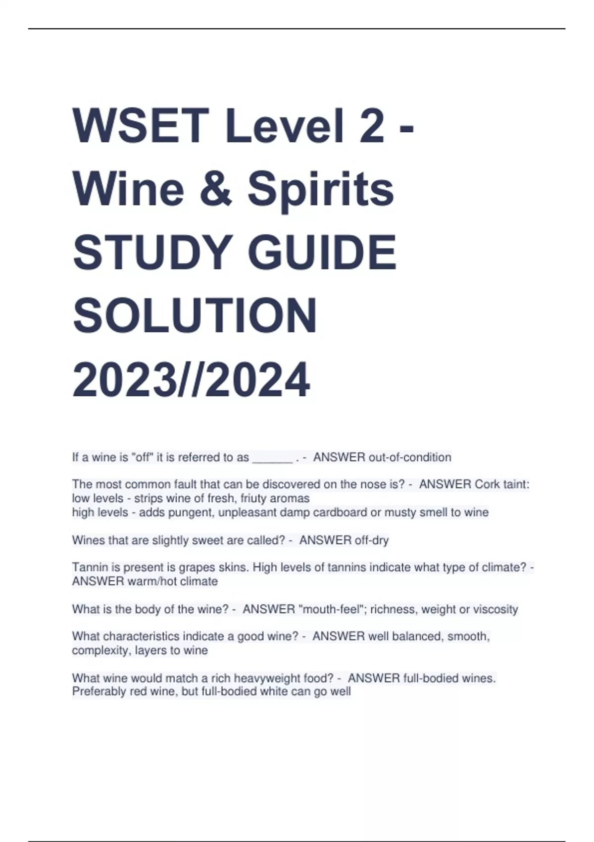 WSET Level 2 - Wine & Spirits STUDY GUIDE SOLUTION 2023//2024 If a wine is "off" it is referred to as ______ . - ANSWER out-of-condition The most common fault that can be discovered on the nose is? - ANSWER Cork taint: low levels - strips wine of fresh, friuty aromas high levels - adds pungent, unpleasant damp cardboard or musty smell to wine Wines that are slightly sweet are called? - ANSWER off-dry Tannin is present is grapes skins. High levels of tannins indicate what type of climate? - ANSWER warm/hot climate What is the body of the wine? - ANSWER "mouth-feel"; richness, weight or viscosity What characteristics indicate a good wine? - ANSWER well balanced, smooth, complexity, layers to wine What wine would match a rich heavyweight food? - ANSWER full-bodied wines. Preferably red wine, but full-bodied white can go well What does a wine need to match tomatoes, olive oil and vinegar? - ANSWER high acidity If you have a dry wine with a dessert what happens to the wine? - ANSWER it will seem tart and over-acidic What component in wine is a good match with protein? - ANSWER wines with high levels of tannin In order to grow a vine needs: a, b, c, d, e - ANSWER a. Carbon dioxide (CO2) b. Sunlight c. Water d. Warmth e. Nutrients What affects the style and quality of wine each year? - ANSWER Climate; weather conditions vary from year to year What are four vineyard activies? - ANSWER 1. careful pruning 2. controlling the number of bunches of grapes on each vine 3. pest control 4. careful positioning of leaves to increase or decrease temperature of grape bunches, or their degree of exposure to sunlight Lower yields result in ________ grapes - ANSWER riper; with more concentrated flavors What are two pests in the vineyard? - ANSWER Animal pests (birds & insects) Fungal diseases (long-term diseases caused by fungi, bacteria, or viruses When does harvesting occur? - ANSWER once the grapes have ripened. End of September or end of August if it's a good summer White wines and red wines are both crushed but what extra step happens to white wines after they have been crushed? - ANSWER they are pressed to separate juice from skins What temperature does white wine get fermented at? - ANSWER 12-22 Celsius (53.6- 71.6 Fahrenheit): preserves delicate fruit aromas