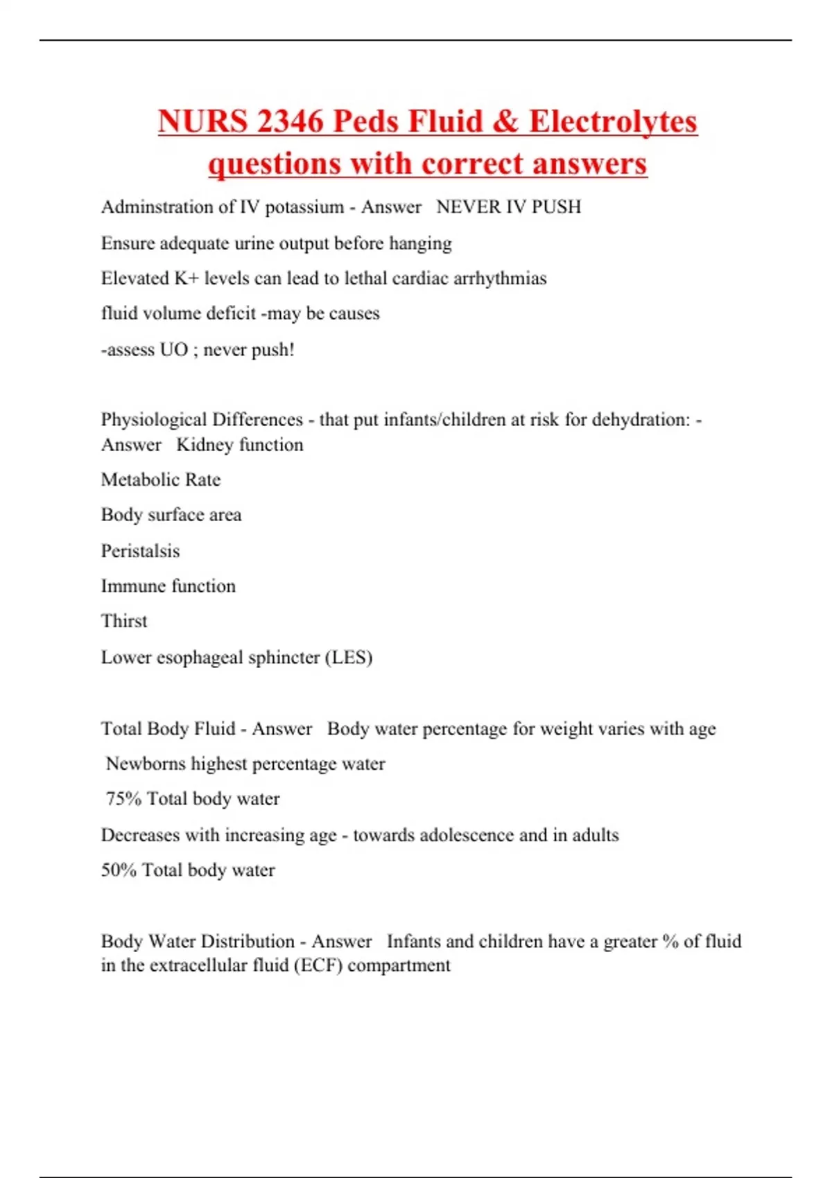 Adminstration of IV potassium - Answer NEVER IV PUSH Ensure adequate urine output before hanging Elevated K+ levels can lead to lethal cardiac arrhythmias fluid volume deficit -may be causes -assess UO ; never push! Physiological Differences - that put infants/children at risk for dehydration: - Answer Kidney function Metabolic Rate Body surface area Peristalsis Immune function Thirst Lower esophageal sphincter (LES) Total Body Fluid - Answer Body water percentage for weight varies with age Newborns highest percentage water 75% Total body water Decreases with increasing age - towards adolescence and in