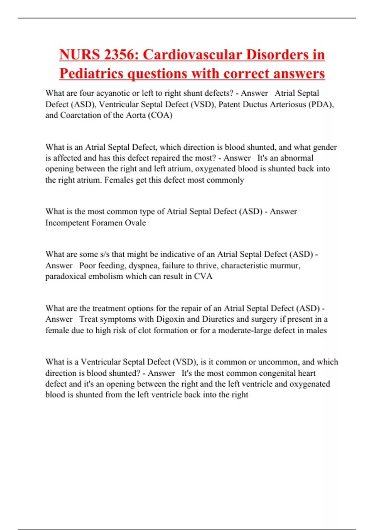 NURS 2356: Cardiovascular Disorders in Pediatrics questions with correct answers
