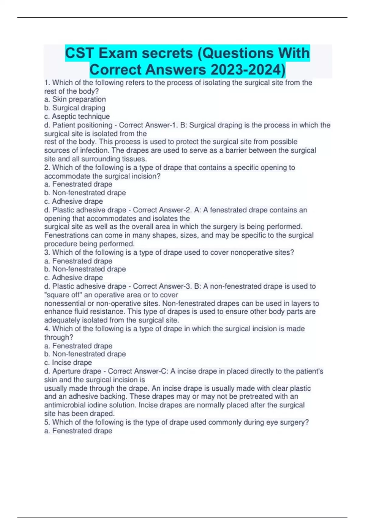 CST Exam secrets (Questions With Correct Answers ) 1. Which of the following refers to the process of isolating the surgical site from the rest of the body? a. Skin preparation b. Surgical draping c. Aseptic technique d. Patient positioning - Correct Answer-1. B: Surgical draping is the process in which the surgical site is isolated from the rest of the body. This process is used to protect the surgical site from possible sources of infection. The drapes are used to serve as a barrier between the surgical site and all surrounding tissues. 2. Which of the following is a type of drape that contains a specific opening to accommodate the surgical incision? a. Fenestrated drape b. Non-fenestrated drape c. Adhesive drape d. Plastic adhesive drape - Correct Answer-2. A: A fenestrated drape contains an opening that accommodates and isolates the surgical site as well as the overall area in which the surgery is being performed. Fenestrations can come in many shapes, sizes, and may be specific to the surgical procedure being performed. 3. Which of the following is a type of drape used to cover nonoperative sites? a. Fenestrated drape b. Non-fenestrated drape c. Adhesive drape d. Plastic adhesive drape - Correct Answer-3. B: A non-fenestrated drape is used to "square off" an operative area or to cover nonessential or non-operative sites. Non-fenestrated drapes can be used in layers to enhance fluid resistance. This type of drapes is used to ensure other body parts are adequately isolated from the surgical site. 4. Which of the following is a type of drape in which the surgical incision is made through? a. Fenestrated drape b. Non-fenestrated drape c. Incise drape d. Aperture drape - Correct Answer-C: A incise drape in placed directly to the patient's skin and the surgical incision is usually made through the drape. An incise drape is usually made with clear plastic and an adhesive backing. These drapes may or may not be pretreated with an antimicrobial iodine solution. Incise drapes are normally placed after the surgical site has been draped. 5. Which of the following is the type of drape used commonly during eye surgery? a. Fenestrated drape b. Non-fenestrated drape c. Incise drape d. Aperture drape - Correct Answer-5. D: An aperture drape is commonly used during eye surgery. It contains an opening that is surrounded by an adhesive backing. An aperture drape is used as a benefit to the surgeon in order to better visualize important landmarks or anatomical structures. 6. Which of the following skin preparation products provide a rapid decrease in the level of microorganisms? a. Alcohol and iodine b. Alcohol and chlorhexidine c. Iodine and chlorhexidine d. Chlorhexidine and peroxide - Correct Answer-6. A: Alcohol and iodine provide similar qualities in rapid decrease in the level of microorganisms. Alcohol is usually used at a concentration of 70%. Although iodine is as effective as alcohol for skin preparation, it should be removed in a timely fashion as it can cause skin irritation for the patient. 7. What is the benefit of using chlorhexidine for the purpose of skin preparation? a. Chlorhexidine removes microorganisms more rapidly than alcohol b. Chlorhexidine removes a greater quantity of microorganisms than alcohol c. Chlorhexidine removes microorganisms more rapidly than iodine d. Chlorhexidine has a residual effect of 5 to 6 hours - Correct Answer-7. D: Although chlorhexidine does not provide a rapid reduction in microorganism quantities like alcohol and iodine, it is a beneficial product for presurgical skin preparation because it has a residual effect of 5 to 6 hours. 8. What is the first level, or bottom, of the pyramid in Maslow's hierarchy of needs? a. Safety b. Esteem c. Physiological d. Love and Belonging - Correct Answer-8. C: The bottom level of Maslow's hierarchy of needs is physiological. The physiological level refers to the patient's basic needs in order to sustain life: food, water, air, and temperature regulation. 9. Which of the following describes the process in which the surgical technologist rids his/her skin of microorganisms prior to a surgical procedure? a. Skin preparation b. Aseptic technique c. Surgical scrub process d. Decontamination procedure - Correct Answer-9. C: The surgical scrub process is performed by all operating room personnel, including surgical technologists, who will be present in the sterile field, touching and handling sterile instruments, and contacting the surgical incision. The goal is to sterilize the skin and render it clean for surgery. 10. Which of the following is the normal lab value for white blood cells? Continues...