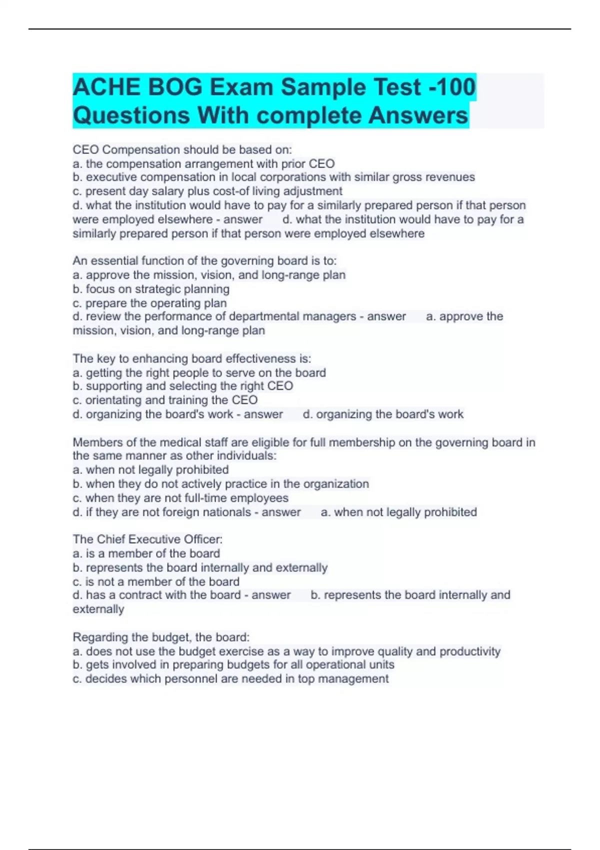 ACHE BOG Exam Sample Test -100 Questions With complete Answers CEO Compensation should be based on: a. the compensation arrangement with prior CEO b. executive compensation in local corporations with similar gross revenues c. present day salary plus cost-of living adjustment d. what the institution would have to pay for a similarly prepared person if that person were employed elsewhere d. what the institution would have to pay for a similarly prepared person if that person were employed elsewhere An essential function of the governing board is to: a. approve the mission, vision, and long-range plan b. focus on strategic planning c. prepare the operating plan d. review the performance of departmental managers a. approve the mission, vision, and long-range plan The key to enhancing board effectiveness is: a. getting the right people to serve on the board b. supporting and selecting the right CEO c. orientating and training the CEO d. organizing the board's work d. organizing the board's work Members of the medical staff are eligible for full membership on the governing board in the same manner as other individuals: a. when not legally prohibited b. when they do not actively practice in the organization c. when they are not full-time employees d. if they are not foreign nationals a. when not legally prohibited The Chief Executive Officer: a. is a member of the board b. represents the board internally and externally c. is not a member of the board d. has a contract with the board b. represents the board internally and externally Regarding the budget, the board: a. does not use the budget exercise as a way to improve quality and productivity b. gets involved in preparing budgets for all operational units c. decides which personnel are needed in top management d. establishes guidelines and makes final choices among competing opportunities d. establishes guidelines and makes final choices among competing opportunities The individual or group responsible for establishing policy, maintaining quality of care, and providing for institutional management planning is the: a. COO b. Medical Staff Medical Committee c. Governing Body d. CEO c. Governing Body A correct statement regarding trustee serving as fiduciaries is that they can: a. be indicted for alleged theft of facility funds and improper expenditures of facility funds for personal reasons. b. be released from responsibility by giving the audit committee final authority in high risk areas of financial matters, without any action by the whole board c. be held personally liable for wrongful acts or omissions by corporate officers or co-trustees by virtue of their position as trustees d. waive their fiduciary responsibility as a community organization a. be indicted for alleged theft of facility funds and improper expenditures of facility funds for personal reasons. Ultimate responsibility for the mission statement rests with the: a. CEO and medical staff b. Governing Board c. Community and CEO d. CEO b. Governing Board A key reason for choosing board members is because: a. other board members want to listen to their opinions. b. of what they can do for the organization c. have high status in the community c. physicians will listen to them they can b. of what they can do for the organization The bylaws of healthcare organization should include which of the following? a. Committee scope and function b. The privileges of the medical staff c. The names of the stockholders in the organization c. Composition of the governing board, committee, and officers c. Composition of the governing board, committee, and officers Successful approaches to strategic planning include: a. a well-written mission statement, long-range plane, and fiscal plan plus the history and discussion surrounding them b. avoidance of high risk decision c. not paying attention to competitor's activity d. using rules and past experiences as a guide to future action a. a well-written mission statement, long-range plane, and fiscal plan plus the history and discussion surrounding them The primary challenge facing a prospector is: a. protecting and increasing current services (product) or market share through technical efficiency, cost improvements, or differentiation strategies b. managing diversification successfully, to guard against expanding too rapidly or into areas they have little knowledge c. managing simultaneously the difficult task of pursuing new markets and services while avoiding erosion of current services in existing markets d. creating stability by sticking with strategic plan long enough to accumulate experience and to develop consistent leadership avoiding random diversification efforts. b. managing diversification successfully, to guard against expanding too rapidly or into areas they have little knowledge In the introductory stage of a product life cycle: a. the introductory stage can be short b. the introductory stage can be long c. sales and revenue growth is slow c. all of the above c. all of the above The primary task of marketing is to: a. bring about voluntary and involuntary exchanges of value b. attract new advertiser c. bring about exchanges of values d. advertise new and existing services c. bring about exchanges of values It would be incorrect to say that: a. an organization's image is a function of all that the organization has done as well as what it has attempted to communicate b. people's images of an organization always reflects their true attitudes toward the organization c. an organization's image is largely the result of public relations, advertising, selling, and communication efforts. d. responsibility for the creation of the organization's image does not lie merely with the marketer c. an organization's image is largely the result of public relations, advertising, selling, and communication efforts. It is important to understand the consumer adoption process because: a. the organization may be able to convince the consumer to pass over awareness