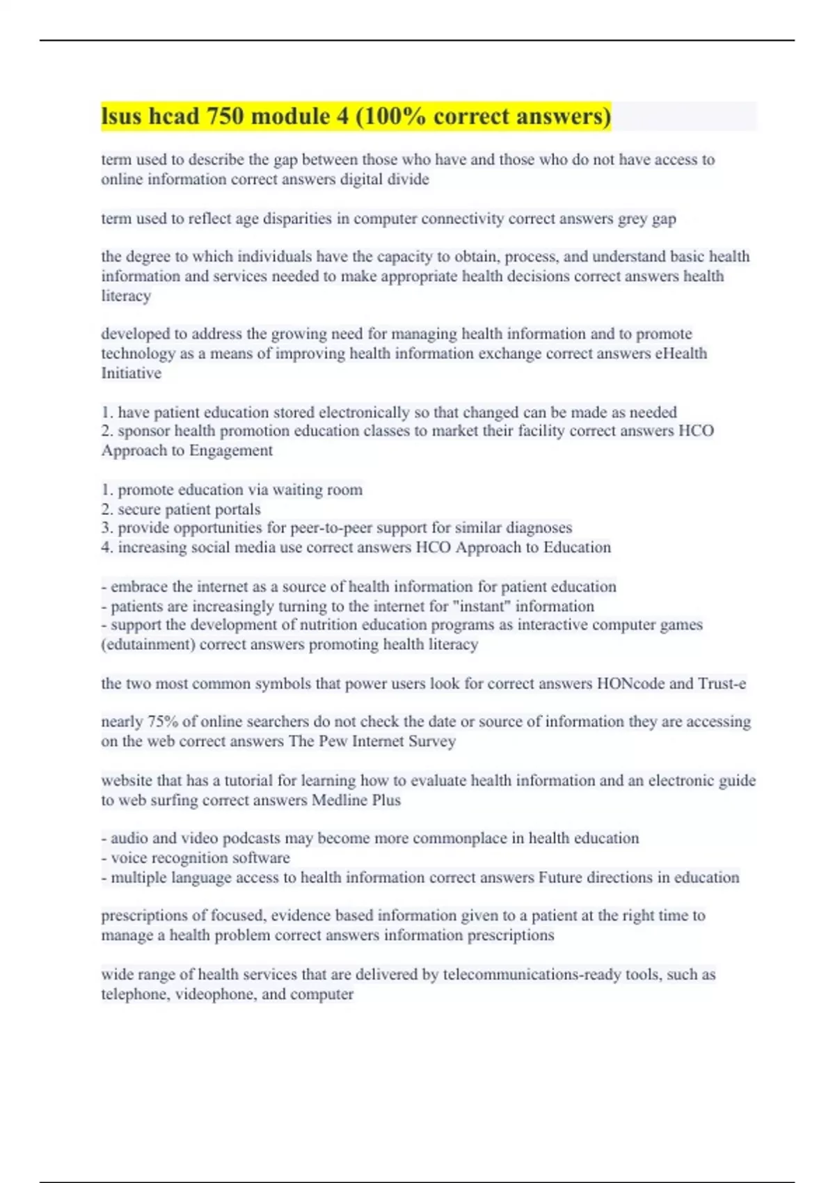 term used to describe the gap between those who have and those who do not have access to online information correct answers digital divide term used to reflect age disparities in computer connectivity correct answers grey gap the degree to which individuals have the capacity to obtain, process, and understand basic health information and services needed to make appropriate health decisions correct answers health literacy developed to address the growing need for managing health information and to promote technology as a means of improving health information exchange correct answers eHealth Initiative 1. have patient education stored electronically so that changed can be made as needed 2. sponsor health promotion education classes to market their facility correct answers HCO Approach to Engagement 1. promote education via waiting room 2. secure patient portals 3. provide opportunities for peer-to-peer support for similar diagnoses 4. increasing social media use correct answers HCO Approach to Education - embrace the internet as a source of health information for patient education - patients are increasingly turning to the internet for "instant" information - support the development of nutrition education programs as interactive computer games (edutainment) correct answers promoting health literacy the two most common symbols that power users look for correct answers HONcode and Trust-e nearly 75% of online searchers do not check the date or source of information they are accessing on the web correct answers The Pew Internet Survey website that has a tutorial for learning how to evaluate health information and an electronic guide to web surfing correct answers Medline Plus - audio and video podcasts may become more commonplace in health education - voice recognition software - multiple language access to health information correct answers Future directions in education prescriptions of focused, evidence based information given to a patient at the right time to manage a health problem correct answers information prescriptions wide range of health services that are delivered by telecommunications-ready tools, such as telephone, videophone, and computer