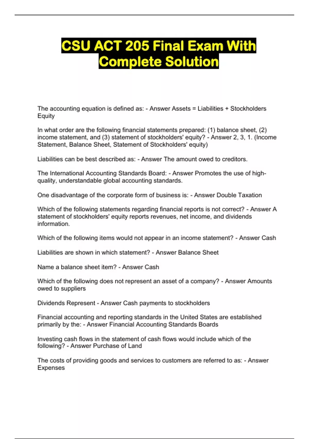 CSU ACT 205 Final Exam With Complete Solution...