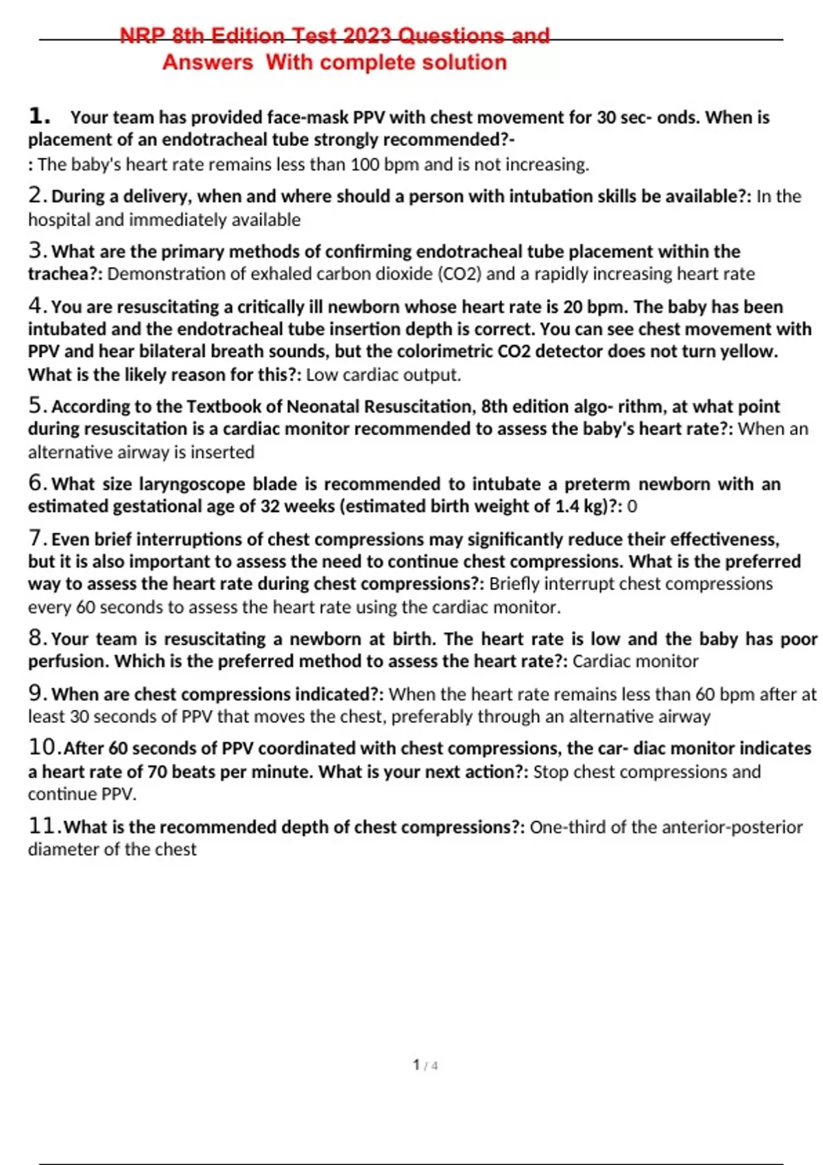 1. Your team has provided face-mask PPV with chest movement for 30 sec- onds. When is placement of an endotracheal tube strongly recommended?- : The baby's heart rate remains less than 100 bpm and is not increasing. 2. During a delivery, when and where should a person with intubation skills be available?: In the hospital and immediately available 3. What are the primary methods of confirming endotracheal tube placement within the trachea?: Demonstration of exhaled carbon dioxide (CO2) and a rapidly increasing heart rate 4. You are resuscitating a critically ill newborn whose heart rate is 20 bpm. The baby has been intubated and the endotracheal tube insertion depth is correct. You can see chest movement with PPV and hear bilateral breath sounds, but the colorimetric CO2 detector does not turn yellow. What is the likely reason for this?: Low cardiac output. 5. According to the Textbook of Neonatal Resuscitation, 8th edition algo- rithm, at what point during resuscitation is a cardiac monitor recommended to assess the baby's heart rate?: When an alternative airway is inserted 6. What size laryngoscope blade is recommended to intubate a preterm newborn with an estimated gestational age of 32 weeks (estimated birth weight of 1.4 kg)?: 0 7. Even brief interruptions of chest compressions may significantly reduce their effectiveness, but it is also important to assess the need to continue chest compressions. What is the preferred way to assess the heart rate during chest compressions?: Briefly interrupt chest compressions every 60 seconds to assess the heart rate using the cardiac monitor. 8. Your team is resuscitating a newborn at birth. The heart rate is low and the baby has poor perfusion. Which is the preferred method to assess the heart rate?: Cardiac monitor 9. When are chest compressions indicated?: When the heart rate remains less than 60 bpm after at least 30 seconds of PPV that moves the chest, preferably through an alternative airway 10. After 60 seconds of PPV coordinated with chest compressions, the car- diac monitor indicates a heart rate of 70 beats per minute. What is your next action?: Stop chest compressions and continue PPV. 11. What is the recommended depth of chest compressions?: One-third of the anterior-posterior diameter of the chest 12. During chest compressions, which of the following is correct?- : To coordinate compressions and ventilations, the compressor calls out one-and-two-and-three-and-breathe-and.... 13. Your team is resuscitating a newborn whose heart rate remains less than 60 bpm despite effective PPV and 60 seconds of chest compressions. You have administered epinephrine intravenously. According to the Textbook of Neonatal Resuscitation, 8th edition, what volume of normal saline flush should you administer?: 3 mL 14. According to the Textbook of Neonatal Resuscitation, 8th edition, what is the suggested initial dose for IV epinephrine (0.1 mg/1 mL=1 mg/10 mL)?: - 0.02 mg/kg (equal to 0.2 mL/kg) 15. When is the administration of a volume expander indicated during new- born resuscitation?: The baby's heart rate is not increasing and there are signs of shock or a history of acute blood loss. 16. Your team is caring for a term newborn whose heart rate is 50 bpm after receiving effective ventilation, chest compressions, and intravenous epinephrine administration. There is a history of acute blood loss around the time of delivery.You administer 10 mL/kg of normal saline (based on the new- born's estimated weight). At what rate should this be administered?: Over 5 to 10 minutes 17. How soon after administration of intravenous epinephrine should you pause compressions and reassess the baby's heart rate?: 60 seconds 18. You are called to the birth of a newborn at 30 weeks gestation. As you prepare your equipment, what concentration of oxygen will you use initially if PPV is required?: 21% to 30% 19. A baby is born at 26 weeks gestation. The initial steps of care, including gentle stimulation, have been completed and the baby is nearly 1-minute old. The baby is not breathing. What is the most appropriate next step?: Begin PPV by mask. 20. Choose the appropriate step(s) to prepare for the birth of a newborn <32 weeks gestation.: Prepare the preheated radiant warmer with a thermal mattress, plastic wrap or bag, a hat, and a skin temperature sensor