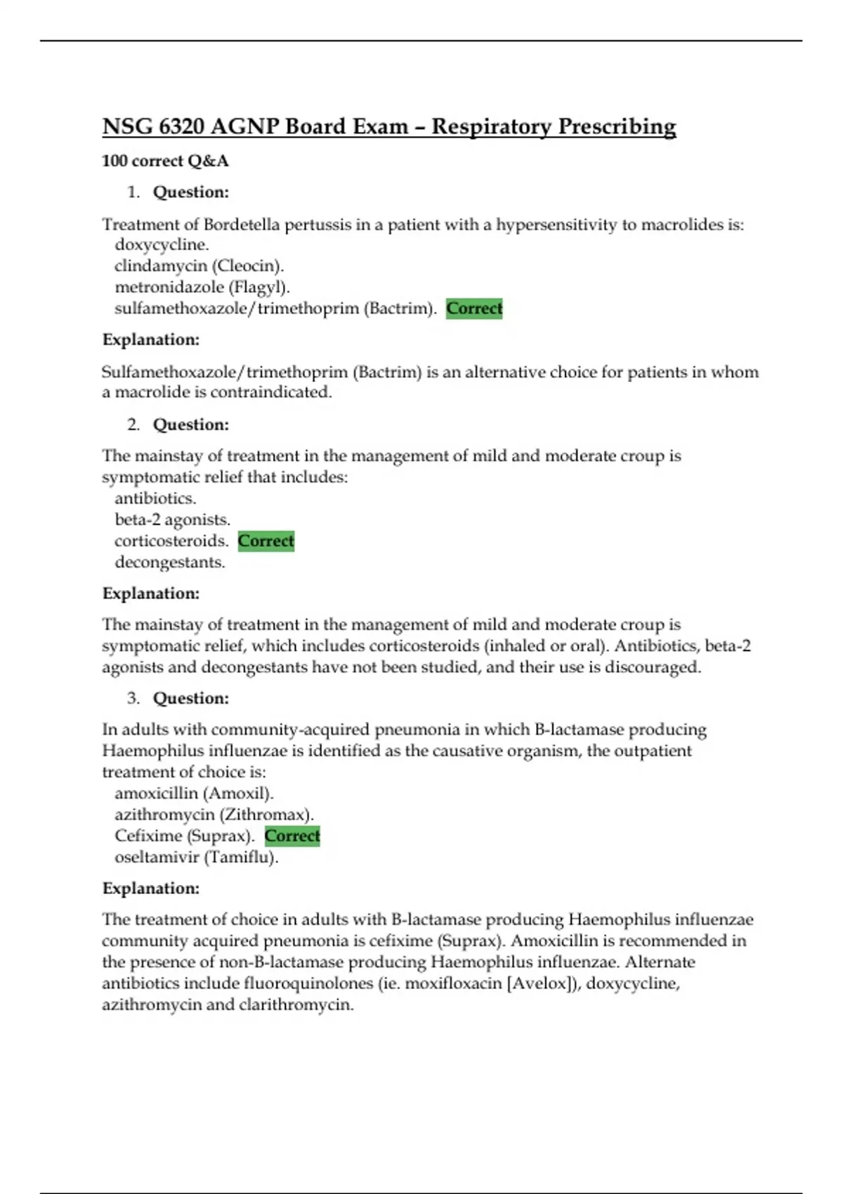 NSG 6320 AGNP Board Exam – Respiratory Prescribing.1. Question: Treatment of Bordetella pertussis in a patient with a hypersensitivity to macrolides is: doxycycline. clindamycin (Cleocin). metronidazole (Flagyl). sulfamethoxazole/trimethoprim (Bactrim). Correct Explanation: Sulfamethoxazole/trimethoprim (Bactrim) is an alternative choice for patients in whom a macrolide is contraindicated. 2. Question: The mainstay of treatment in the management of mild and moderate croup is symptomatic relief that includes: antibiotics. beta-2 agonists. corticosteroids. Correct decongestants.