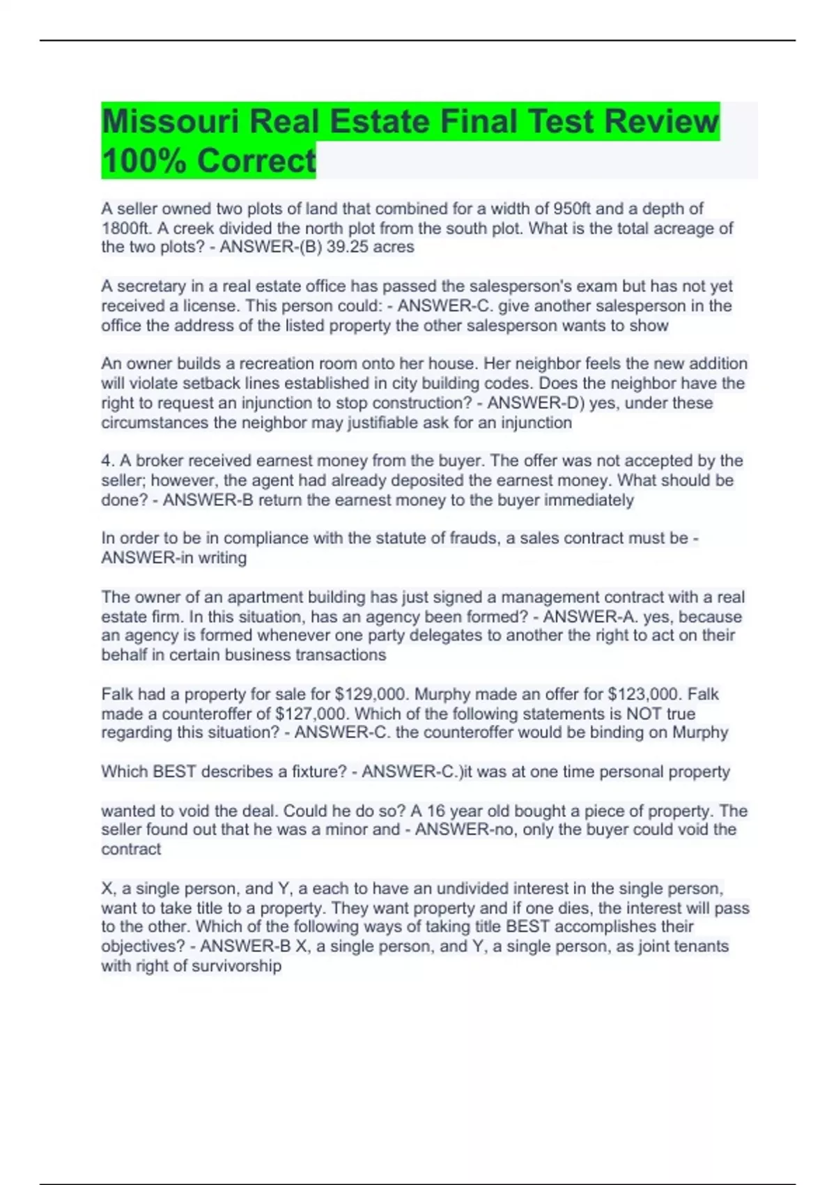 A seller owned two plots of land that combined for a width of 950ft and a depth of 1800ft. A creek divided the north plot from the south plot. What is the total acreage of the two plots? - ANSWER-(B) 39.25 acres A secretary in a real estate office has passed the salesperson's exam but has not yet received a license. This person could: - ANSWER-C. give another salesperson in the office the address of the listed property the other salesperson wants to show An owner builds a recreation room onto her house. Her neighbor feels the new addition will violate setback lines established in city building codes. Does the neighbor have the right to request an injunction to stop construction? - ANSWER-D) yes, under these circumstances the neighbor may justifiable ask for an injunction 4. A broker received earnest money from the buyer. The offer was not accepted by the seller; however, the agent had already deposited the earnest money. What should be done? - ANSWER-B return the earnest money to the buyer immediately In order to be in compliance with the statute of frauds, a sales contract must be - ANSWER-in writing The owner of an apartment building has just signed a management contract with a real estate firm. In this situation, has an agency been formed? - ANSWER-A. yes, because an agency is formed whenever one party delegates to another the right to act on their behalf in certain business transactions Falk had a property for sale for $129,000. Murphy made an offer for $123,000. Falk made a counteroffer of $127,000. Which of the following statements is NOT true regarding this situation? - ANSWER-C. the counteroffer would be binding on Murphy Which BEST describes a fixture? - ANSWER-C.)it was at one time personal property wanted to void the deal. Could he do so? A 16 year old bought a piece of property. The seller found out that he was a minor and - ANSWER-no, only the buyer could void the contract X, a single person, and Y, a each to have an undivided interest in the single person, want to take title to a property. They want property and if one dies, the interest will pass to the other. Which of the following ways of taking title BEST accomplishes their objectives? - ANSWER-B X, a single person, and Y, a single person, as joint tenants with right of survivorship In the event of a dispute over earnest money the broker should - ANSWER-(D hold the money until all parties to the contract sign a release or release it to the courts 12. After listing a home with a broker, a seller told the broker NOT to disclose a major structural defect in the house. The broker should - ANSWER-PD. tell the buyer of the defect prior to the writing of a contract To create a joint tenancy relationship in the ownership of real estate, there must be unity of - ANSWER-C. possession, time, interest and title A seller had his home listed with a broker. During the listing period, the seller found seller and won. What type of listing did the broker most likely have? his own buyer and refused to pay the broker's commission. The broker then sued the - ANSWER-A an exclusive right to sell listing A property manager normally is charged with all the following duties except: - ANSWER-D repairing a tenants fixture In 1988, John Smith built a 3 story apartment building. To comply with the Federal Fair Housing: - ANSWER-A handicap tenants would need to have access to at least the 1st floor Elective credits for continuing education could be granted for a course: - ANSWER-That is exclusively videotaped for classroom courses Dole refused to sell his land to the local park district. He felt that the price the park district offered for the land was not sufficient consideration. If the park district were to pursue the matter in court, what proceeding would it institute to try to force Dole to sell his land? - ANSWER-condemnation semi-rural area that is about five years old. They regional airport that will place their home about one mile from its end. If the airport is The Rose family owns a home in a recently announced plans for a new directly in line with a main runway, constructed, will this diminish the value of the Rose home? - ANSWER-yes, because of external obsolescence Which BEST describes the sale price for a property in an option agreement? - ANSWER-the buyer is guaranteed a fixed price when the option is signed 21. ABC Realty employs Mary as a salesperson. It does not require her to attend sales meetings nor spend certain hours in the office. Mary is not reimbursed for normal expenses and is responsible for paying her own income and social security taxes. Her status is best described as that of - ANSWER-an independent contractor The value of a property was $125,000 but listed with a broker for $145,000. The seller told the broker he would take $115,000. The broker told this information to a buyer who promptly offered $117,000 that the seller accepted. If the seller found out about this, what could the seller do? - ANSWER-A refuse to pay the broker's commission as the broker violated his obligations 23. A person seller. She had incorporated her business owned her own company specializing in negotiating sales for buyers and but does not get listings or sell properties. Does she need a real estate license to do this? - ANSWER-Ayes, she and the corporation need a broker's license If the seller asked the violated fiduciary relationship by respectfully refusing to answer? broker what race the buyers were would the broker have - ANSWER-no, because race, color, religion, national origin and sex are not material Which of the following items allows a sales contract to be voided? - ANSWER-A one of the contract contingencies CANNOT be met A complaint had been filed against a salesperson. However, the salesperson was in the process of switching to another broker. Which of the following is true regarding this situation? - ANSWER-the complainant would get a written record of the salesperson's answer to the complaint All of the following would be consid