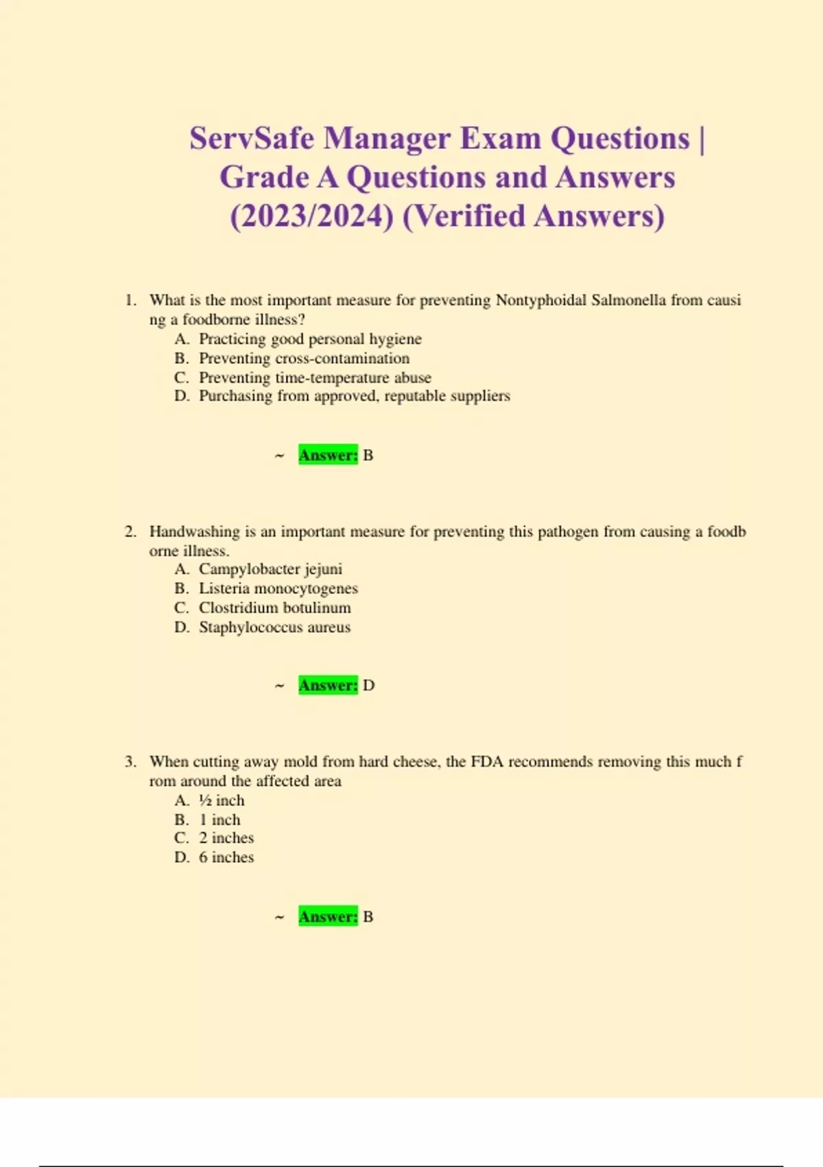 ServSafe Manager Exam Questions | Grade A Questions and Answers (2023/2024) (Verified Answers) 1. What is the most important measure for preventing Nontyphoidal Salmonella from causing a foodborne illness? A. Practicing good personal hygiene B. Preventing cross-contamination C. Preventing time-temperature abuse D. Purchasing from approved, reputable suppliers ~ Answer: B 2. Handwashing is an important measure for preventing this pathogen from causing a foodborne illness. A. Campylobacter jejuni B. Listeria monocytogenes C. Clostridium botulinum D. Staphylococcus aureus ~ Answer: D 3. When cutting away mold from hard cheese, the FDA recommends removing this much from around the affected area A. ½ inch B. 1 inch C. 2 inches D. 6 inches ~ Answer: B 4. . Aflatoxins are linked to this pathogen A. Bacteria B. Viruses C. Parasites D. Molds ~ Answer: D 5. This toxin causes an illness with neurological symptoms such as the reversal of hot and cold sensations A. Histamine B. Ciguatoxin C. Domoic acid D. Brevetoxin ~ Answer: B 6. A guest in a New England restaurant experienced a tingling in the mouth and face after eating oysters. What is the likely illness? A. Ciguatera fish poisoning B. Amnesic shellfish poisoning C. Paralytic shellfish poisoning D. Neurotoxic shellfish poisoning ~ Answer: C 7. Which fish are associated with ciguatoxin? A. Tuna B. Grouper C. Mackerel D. Mahi Mahi ~ Answer: B 8. This plant food is toxic when undercooked A. Raw kidney beans B. Fresh asparagus C. Raw edamame D. Raw sweetcorn ~ Answer: A 9. Scombroid poisoning can be prevented by A. purchasing fish from approved, reputable suppliers. B. cooking fish to the right internal temperature. C. making sure food handlers wash their hands. D. preventing cross-contamination ~ Answer: A 10. What is the best method from preventing a physical hazard in food from causing an injury? A. Practicing proper food defense B. Preventing cross-contamination C. Proper cleaning and sanitizing D. Purchasing from approved suppliers ~ Answer: D 11. A guest became ill with vomiting and diarrhea within minutes of eating. What type of contamination was the likely cause? A. Viral B. Allergen C. Chemical D. Biological ~ Answer: C