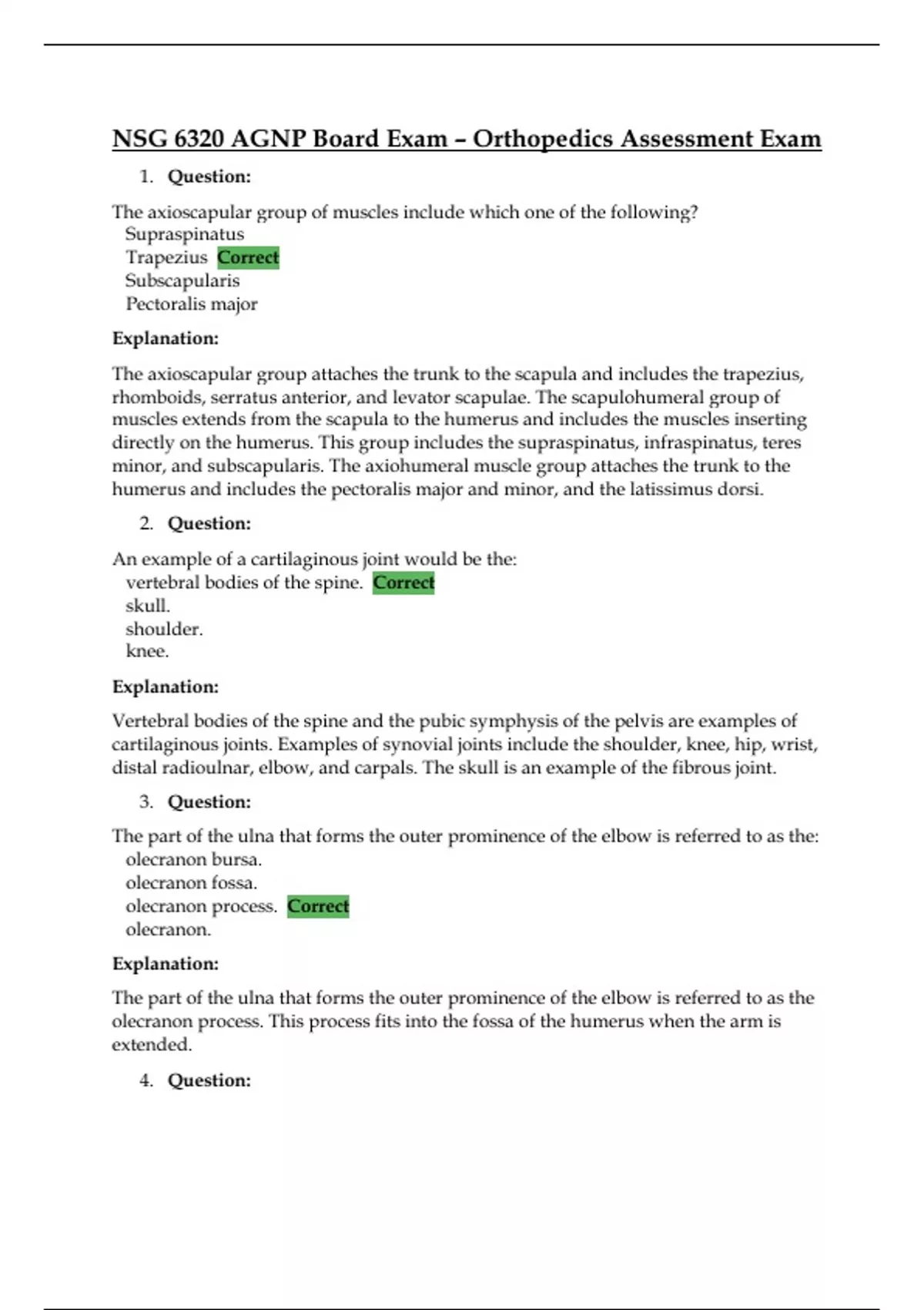 NSG 6320 AGNP Board Exam – Orthopedics Assessment Exam.1. Question: The axioscapular group of muscles include which one of the following? Supraspinatus Trapezius Correct Subscapularis Pectoralis major Explanation: The axioscapular group attaches the trunk to the scapula and includes the trapezius, rhomboids, serratus anterior, and levator scapulae. The scapulohumeral group of muscles extends from the scapula to the humerus and includes the muscles inserting directly on the humerus. This group includes the supraspinatus, infraspinatus, teres minor, and subscapularis. The axiohumeral muscle group attaches the trunk to the humerus and includes the pectoralis major and minor, and the latissimus dorsi. 2. Question: An example of a cartilaginous joint would be the: vertebral bodies of the spine. Correct skull. shoulder. knee. Explanation: Vertebral bodies of the spine and the pubic symphysis of the pelvis are examples of cartilaginous joints. Examples of synovial joints include the shoulder, knee, hip, wrist, distal radioulnar, elbow, and carpals. The skull is an example of the fibrous joint. 3. Question: The part of the ulna that forms the outer prominence of the elbow is referred to as the: olecranon bursa. olecranon fossa. olecranon process. Correct olecranon. Explanation: The part of the ulna that forms the outer prominence of the elbow is referred to as the olecranon process. This process fits into the fossa of the humerus when the arm is extended.