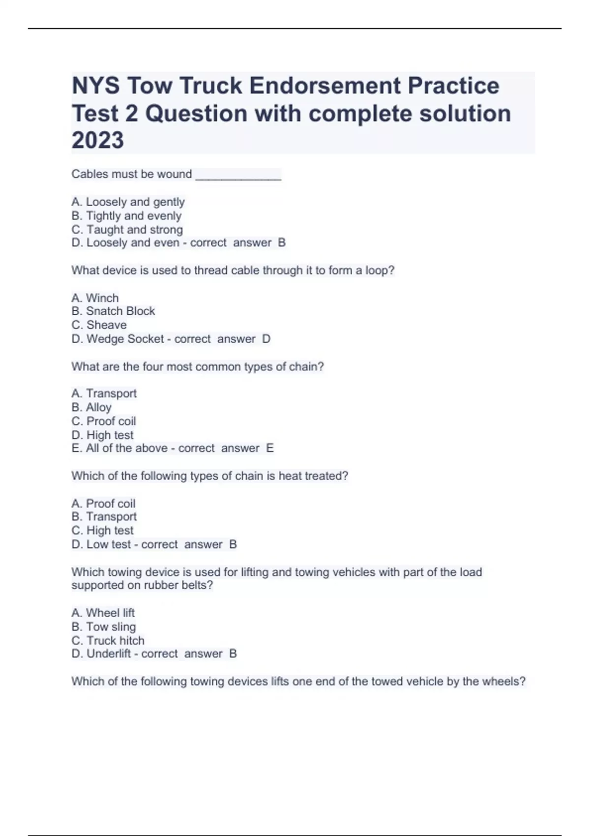 NYS Tow Truck Endorsement Practice Test 2 Question with complete solution 2023Cables must be wound _____________ A. Loosely and gently B. Tightly and evenly C. Taught and strong D. Loosely and even B What device is used to thread cable through it to form a loop? A. Winch B. Snatch Block C. Sheave D. Wedge Socket D What are the four most common types of chain? A. Transport B. Alloy C. Proof coil D. High test E. All of the above E Which of the following types of chain is heat treated? A. Proof coil B. Transport C. High test D. Low test B Which towing device is used for lifting and towing vehicles with part of the load supported on rubber belts? A. Wheel lift B. Tow sling C. Truck hitch D. Underlift B Which of the following towing devices lifts one end of the towed vehicle by the wheels? A. Wheel lift B. Tow sling C. Truck hitch D. Underlift A Which of the following towing devices tows vehicles by lifting one end of them with forks from under the axle? A. Wheel lift B. Tow sling C. Truck hitch D. Underlift D