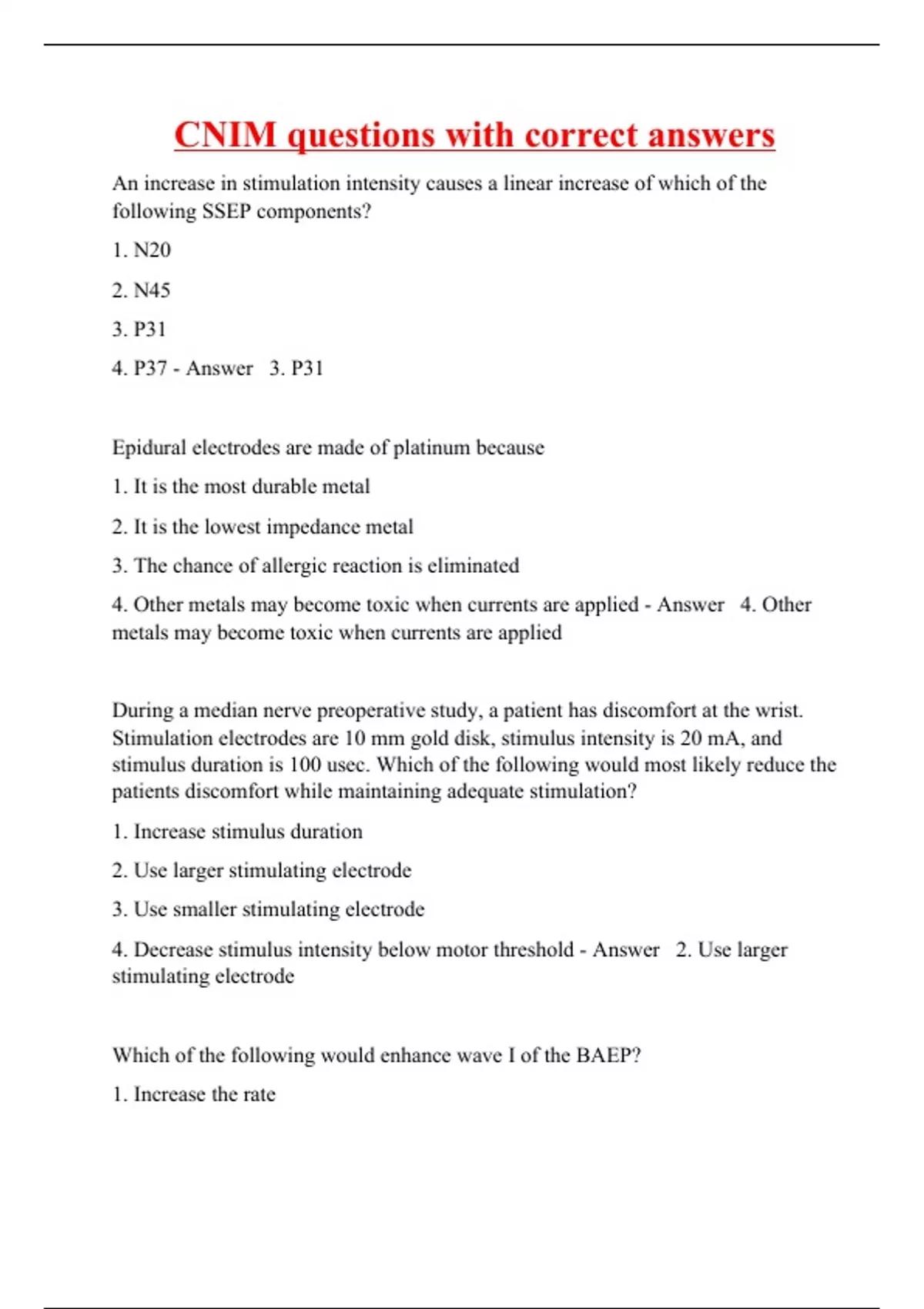 An increase in stimulation intensity causes a linear increase of which of the following SSEP components? 1. N20 2. N45 3. P31 4. P37 - Answer 3. P31 Epidural electrodes are made of platinum because 1. It is the most durable metal 2. It is the lowest impedance metal 3. The chance of allergic reaction is eliminated 4. Other metals may become toxic when currents are applied - Answer 4. Other metals may become toxic when currents are applied During a median nerve preoperative study, a patient has discomfort at the wrist. Stimulation electrodes are 10 mm gold disk, stimulus intensity is 20 mA, and stimulus duration is 100 usec. Which of the following would most likely reduce the patients discomfort while maintaining adequate stimulation? 1. Increase stimulus duration 2. Use larger stimulating electrode 3. Use smaller stimulating electrode 4. Decrease stimulus intensity below motor threshold - Answer 2. Use larger stimulating electrode Which of the following would enhance wave I of the BAEP? 1. Increase the rate