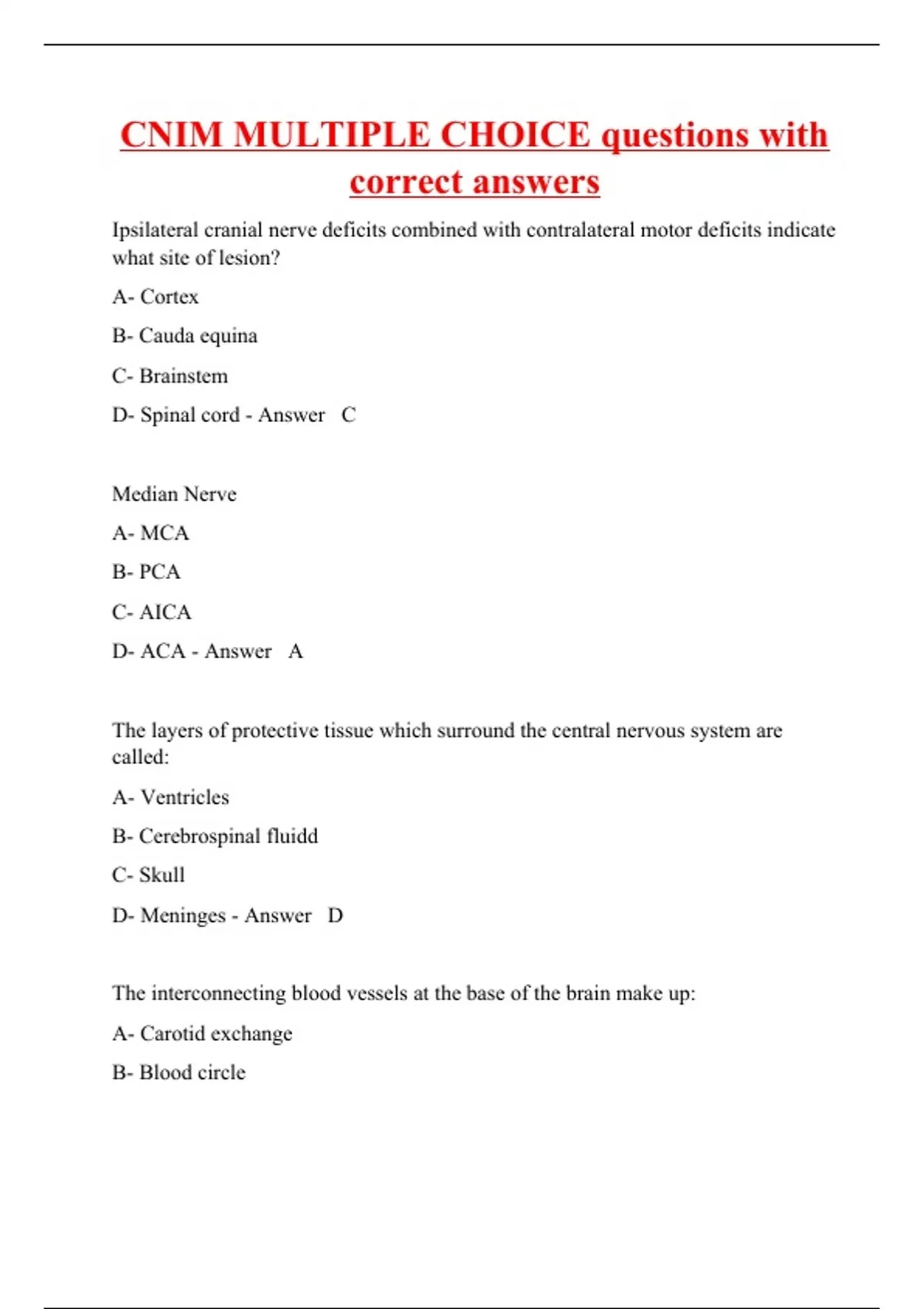Ipsilateral cranial nerve deficits combined with contralateral motor deficits indicate what site of lesion? A- Cortex B- Cauda equina C- Brainstem D- Spinal cord - Answer C Median Nerve A- MCA B- PCA C- AICA D- ACA - Answer A The layers of protective tissue which surround the central nervous system are called: A- Ventricles B- Cerebrospinal fluidd C- Skull D- Meninges - Answer D The interconnecting blood vessels at the base of the brain make up: A- Carotid exchange B- Blood circle
