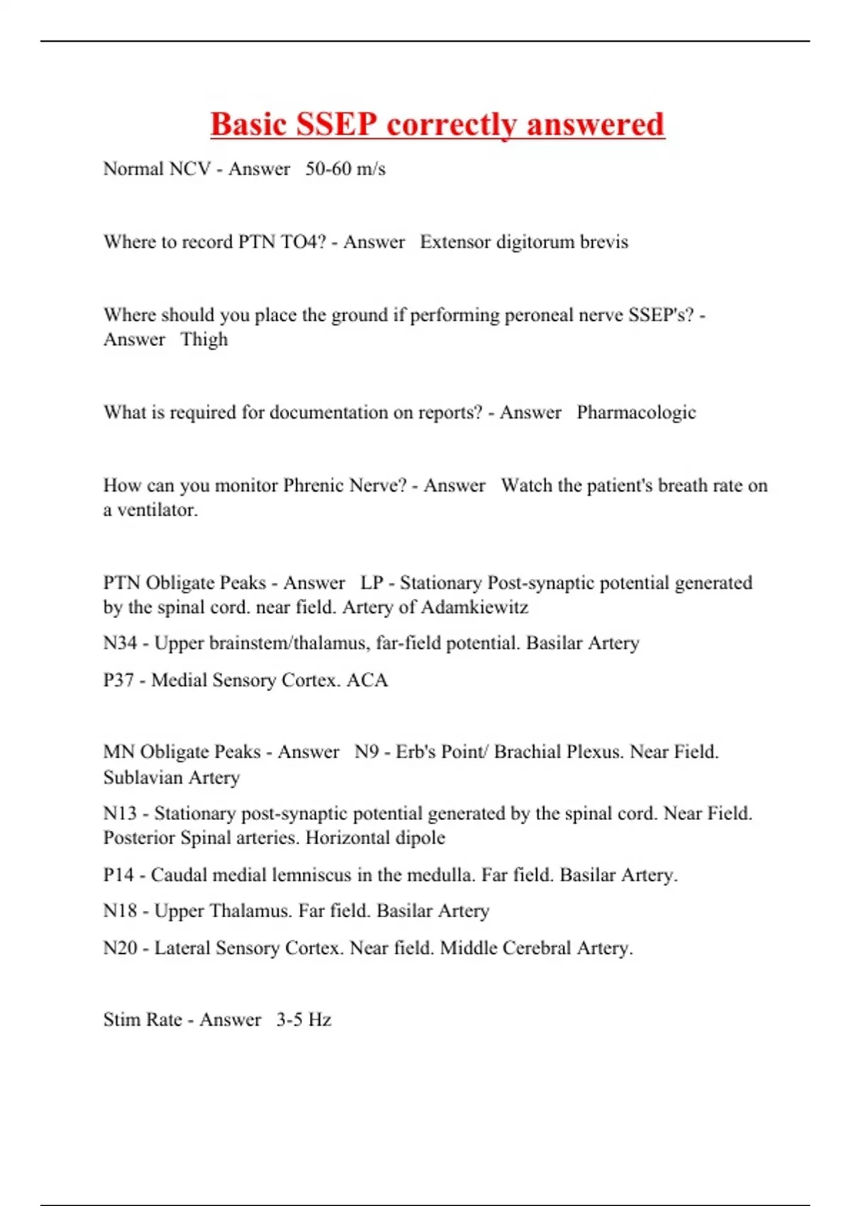 Normal NCV - Answer 50-60 m/s Where to record PTN TO4? - Answer Extensor digitorum brevis Where should you place the ground if performing peroneal nerve SSEP's? - Answer Thigh What is required for documentation on reports? - Answer Pharmacologic How can you monitor Phrenic Nerve? - Answer Watch the patient's breath rate on a ventilator. PTN Obligate Peaks - Answer LP - Stationary Post-synaptic potential generated by the spinal cord. near field. Artery of Adamkiewitz N34 - Upper brainstem/thalamus, far-field potential. Basilar Artery P37 - Medial Sensory Cortex. ACA MN Obligate Peaks - Answer N9 - Erb's Point/ Brachial Plexus. Near Field. Sublavian Artery N13 - Stationary post-synaptic potential generated by the spinal cord. Near Field. Posterior Spinal arteries. Horizontal dipole P14 - Caudal medial lemniscus in the medulla. Far field. Basilar Artery. N18 - Upper Thalamus. Far field. Basilar Artery