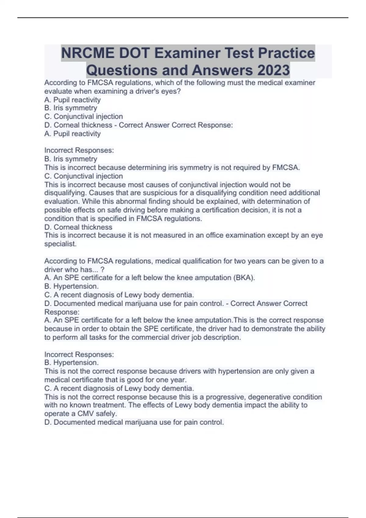 NRCME DOT Examiner Test Practice Questions and Answers 2023