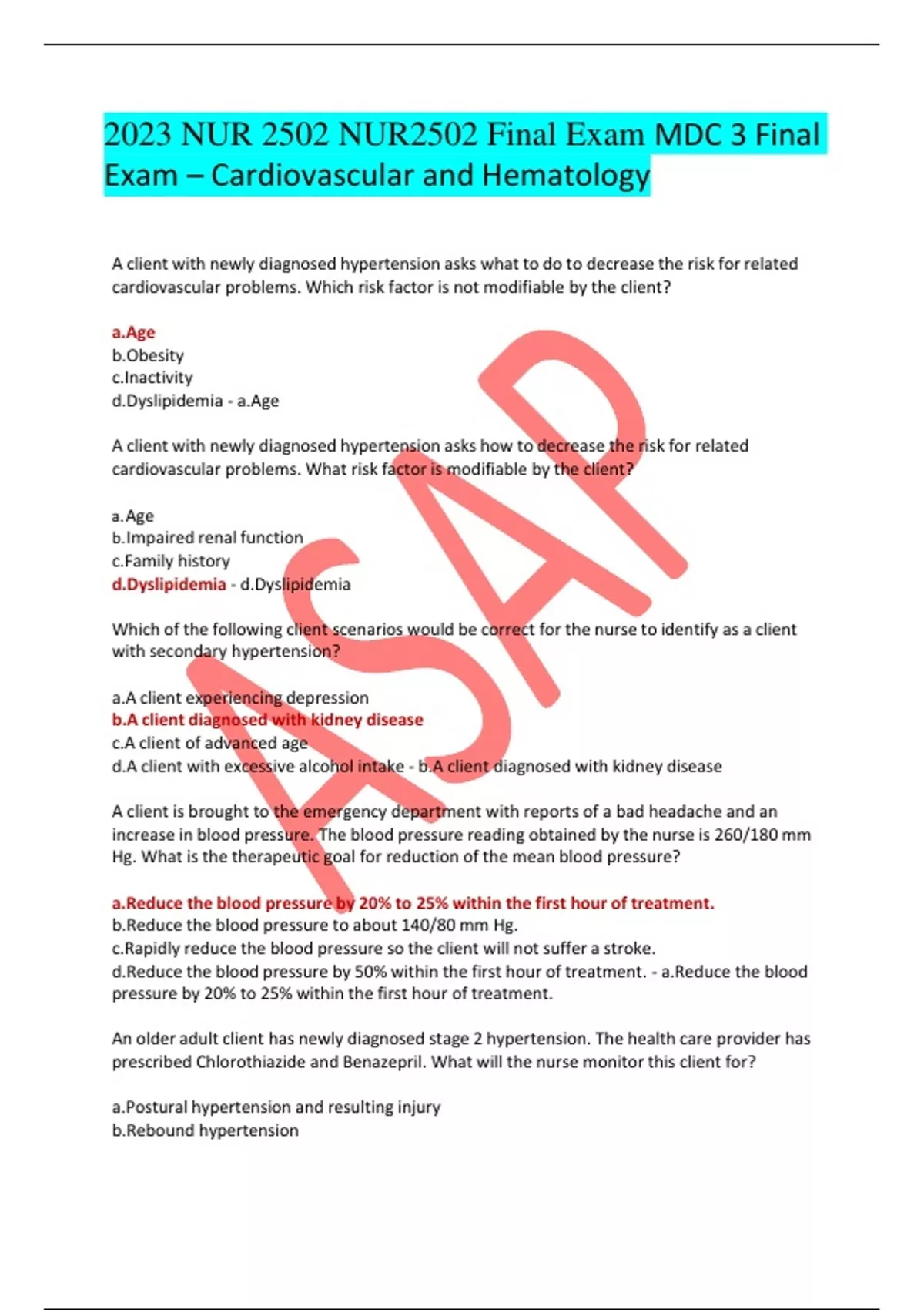 2023 NUR 2502 NUR2502 Final Exam MDC 3 Final Exam – Cardiovascular and Hematology A client with newly diagnosed hypertension asks what to do to decrease the risk for related cardiovascular problems. Which risk factor is not modifiable by the client? a.Age b.Obesity c.Inactivity d.Dyslipidemia - a.Age A client with newly diagnosed hypertension asks how to decrease the risk for related cardiovascular problems. What risk factor is modifiable by the client? a. Age b. Impaired renal function c.Family history d.Dyslipidemia - d.Dyslipidemia Which of the following client scenarios would be correct for the nurse to identify as a client with secondary hypertension? a.A client experiencing depression b.A client diagnosed with kidney disease c.A client of advanced age d.A client with excessive alcohol intake - b.A client diagnosed with kidney disease A client is brought to the emergency department with reports of a bad headache and an increase in blood pressure. The blood pressure reading obtained by the nurse is 260/180 mm Hg. What is the therapeutic goal for reduction of the mean blood pressure? a.Reduce the blood pressure by 20% to 25% within the first hour of treatment. b.Reduce the blood pressure to about 140/80 mm Hg. c.Rapidly reduce the blood pressure so the client will not suffer a stroke. d.Reduce the blood pressure by 50% within the first hour of treatment. - a.Reduce the blood pressure by 20% to 25% within the first hour of treatment. An older adult client has newly diagnosed stage 2 hypertension. The health care provider has prescribed Chlorothiazide and Benazepril. What will the nurse monitor this client for? a.Postural hypertension and resulting injury b.Rebound hypertension c.Sexual dysfunction d.Postural hypotension and resulting injury - d.Postural hypotension and resulting injury The nurse is planning the care of a patient admitted to the hospital with hypertension. What objective will help to meet the needs of this patient? a.Lowering and controlling the blood pressure without adverse effects and without undue cost b.Making sure that the patient adheres to the therapeutic medication regimen c.Instructing the patient to enter a weight loss program and begin an exercise regimen d.Scheduling the patient for all follow-up visits and making phone calls to the home to ensure adherence - a.Lowering and controlling the blood pressure without adverse effects and without undue cost Which describes a situation in which blood pressure is severely elevated and there is evidence of actual or probable target organ damage? a.Hypertensive emergency b.Hypertensive urgency c.Primary hypertension d.Secondary hypertension - a.Hypertensive emergency The nurse is administering medications on a medical-surgical unit. A client is ordered to receive 40 mg oral nadolol for the treatment of hypertension. Before administering the medication, the nurse should the client's heart rate. the client's serum K+ level. the client's urine output. the client. - the client's heart rate. Which diagnostic method is recommended to determine whether left ventricular hypertrophy has occurred? a.Echocardiography b.Electrocardiography c.Blood chemistry d.Blood urea nitrogen - a.Echocardiography A nurse is educati
