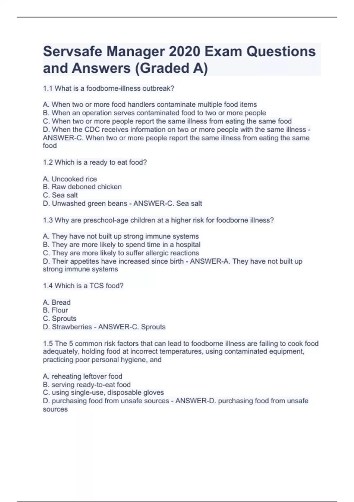 Servsafe Manager 2020 Exam Questions and Answers (Graded A)Servsafe Manager 2020 Exam Questions and Answers (Graded A)Servsafe Manager 2020 Exam Questions and Answers (Graded A)Servsafe Manager 2020 Exam Questions and Answers (Graded A) 1.1 What is a foodborne-illness outbreak? A. When two or more food handlers contaminate multiple food items B. When an operation serves contaminated food to two or more people C. When two or more people report the same illness from eating the same food D. When the CDC receives information on two or more people with the same illness - ANSWER-C. When two or more people report the same illness from eating the same food 1.2 Which is a ready to eat food? A. Uncooked rice B. Raw deboned chicken C. Sea salt D. Unwashed green beans - ANSWER-C. Sea salt 1.3 Why are preschool-age children at a higher risk for foodborne illness? A. They have not built up strong immune systems B. They are more likely to spend time in a hospital C. They are more likely to suffer allergic reactions D. Their appetites have increased since birth - ANSWER-A. They have not built up strong immune systems 1.4 Which is a TCS food? A. Bread B. Flour C. Sprouts D. Strawberries - ANSWER-C. Sprouts 1.5 The 5 common risk factors that can lead to foodborne illness are failing to cook food adequately, holding food at incorrect temperatures, using contaminated equipment, practicing poor personal hygiene, and A. reheating leftover food B. serving ready-to-eat food C. using single-use, disposable gloves D. purchasing