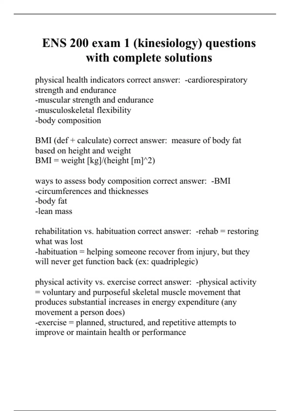 physical health indicators correct answer: -cardiorespiratory strength and endurance -muscular strength and endurance -musculoskeletal flexibility -body composition BMI (def + calculate) correct answer: measure of body fat based on height and weight BMI = weight [kg]/(height [m]^2) ways to assess body composition correct answer: -BMI -circumferences and thicknesses -body fat -lean mass rehabilitation vs. habituation correct answer: -rehab = restoring what was lost -habituation = helping someone recover from injury, but they will never get function back (ex: quadriplegic) physical activity vs. exercise correct answer: -physical activity = voluntary and purposeful skeletal muscle movement that produces substantial increases in energy expenditure (any movement a person does) -exercise = planned, structured, and repetitive attempts to improve or maintain health or performance