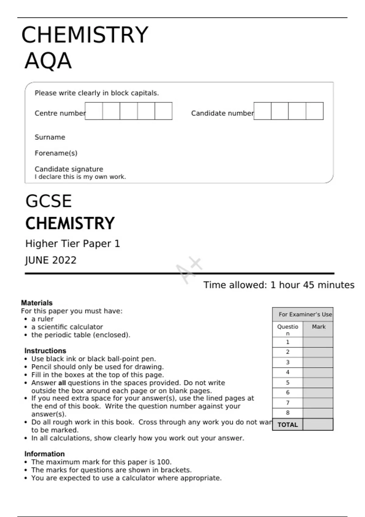 AQA JUNE 2022 GCSE CHEMISTRY Higher Tier Paper 1 FINAL QUESTION PAPER