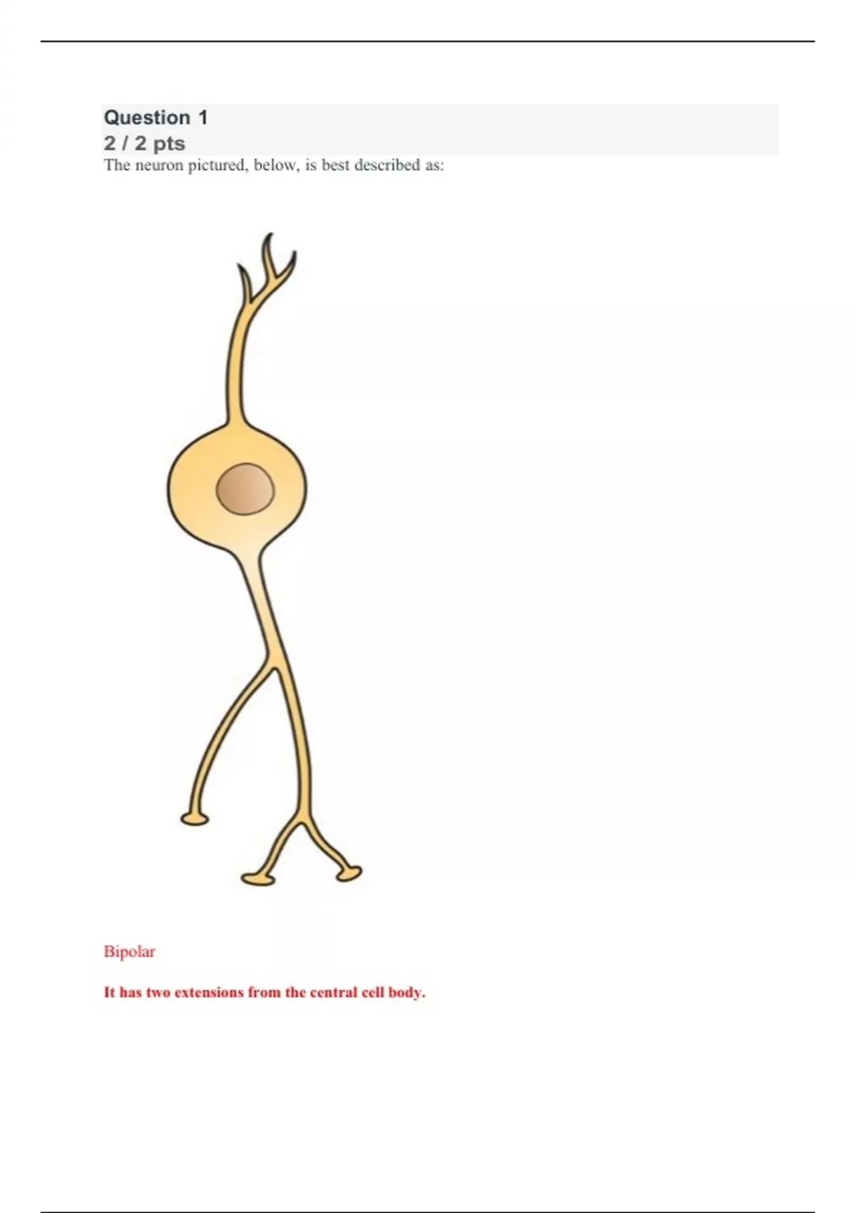 Name and describe what is occurring in the neuron cell membrane in section 4 of the diagram. Include the charge of the membrane during this phase. Name and describe what is occurring in the neuron cell membrane in section 4 of the diagram. Include the charge of the membrane during this phase. Your Answer: • Afterpolarization (Hyperpolarization) Potassium gates are slow to close and there is an undershoot of the potential. • The charge drops below -70mV and then returns to -70mV once at resting state again. Where is the integration center of a reflex located? CNS (central nervous system) What is true about the flexor withdrawal reflex? A. It does not involve interneurons. B. It involves excitatory interneurons. C. It involves inhibitory interneurons. D. The effect of the reflex is to create a co-contraction of two muscles E. A&D F. B&C Label the nerves (A-C) in the figure below: A: B: C: A- Lateral femoral cutaneous B- Femoral nerve C- Saphenous Which of the following is most likely a symptom of ALS? Impaired ability to swallow Decreased sensation in the hands Shrinkage of cerebral cortex Increased size of brain ventricles All the above What is the purpose of the blood-brain barrier? Describe its maintenance from a cellular level. The blood-brain barrier is a diffusion barrier which prevents most particles from entering the central nervous system tissue, keeping the brain and spinal cord separate from general blood circulation. The blood-brain barrier is formed by the relatively impermeable brain capillaries, due to the glial cells astrocytes. Maintenance of the blood-brain-barrier is important to provide a stable chemical environment for the nervous system. A patient damaged the radial nerve. What action is most likely limited? Elbow flexion Hip extension Wrist flexion Wrist extension What is muscle tone and how is it maintained? Muscle tone is the degree at which muscles remain partially contracted while at rest. Muscle tone is continuously monitored and maintained by the cerebellum to keep bones and joints in place. A patient had a CVA in the area indicated by the red x in the figure, below. What type of blindness is the patient most likely to incur? Explain your reasoning. A. Left eye blindness B. Right eye blindness C. Bilateral left visual field blindness D. Bilateral right visual field blindness.