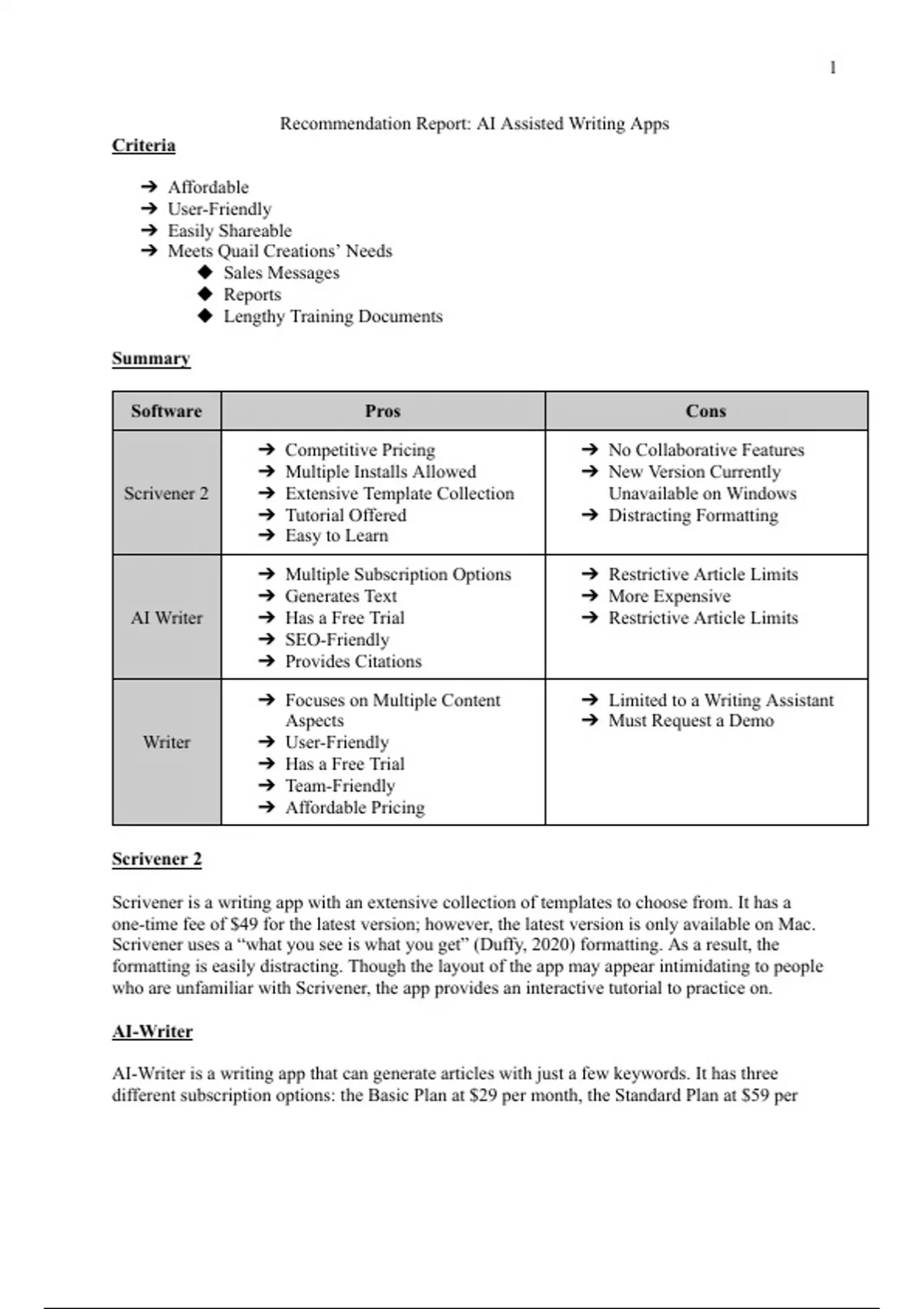 This document is of an assignment on creating a Recommendation Report. The writer is to recommend an AI Assisted Writing App from 3 options based on a set of criteria provided by the professor. This recommendation report compares the 3 AI Assisted Writing Apps in order to determine which one is most suitable to the criteria provided.