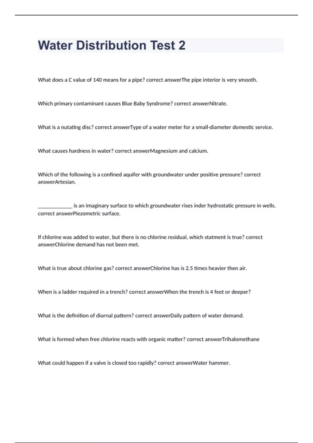 What does a C value of 140 means for a pipe? The pipe interior is very smooth. Which primary contaminant causes Blue Baby Syndrome? Nitrate. What is a nutating disc? Type of a water meter for a small-diameter domestic service. What causes hardness in water? Magnesium and calcium. Which of the following is a confined aquifer with groundwater under positive pressure? Artesian. ____________ is an imaginary surface to which groundwater rises inder hydrostatic pressure in wells. Piezometric surface. If chlorine was added to water, but there is no chlorine residual, which statment is true? Chlorine demand has not been met. What is true about chlorine gas? Chlorine has is 2.5 times heavier then air. When is a ladder required in a trench? When the trench is 4 feet or deeper? What is the definition of diurnal pattern? Daily pattern of water demand. What is formed when free chlorine reacts with organic matter? Trihalomethane What could happen if a valve is closed too rapidly? Water hammer. Which of the following best describe Tier 1 of the Public Notification Rule? A violation that poses an immediate threat to human health. The public must be notify within 24 hours. What is the typical concentration (strength) of bulk sodium hypochlorite solution for desinfecting a water supply 12.5%