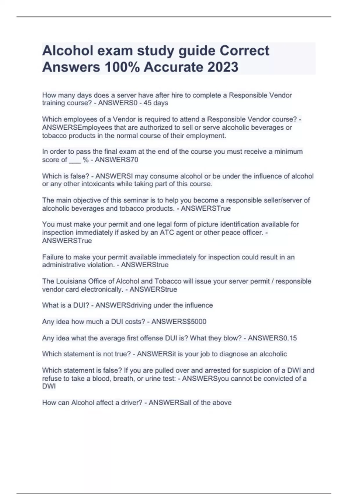 How many days does a server have after hire to complete a Responsible Vendor training course? - ANSWERS0 - 45 days Which employees of a Vendor is required to attend a Responsible Vendor course? - ANSWERSEmployees that are authorized to sell or serve alcoholic beverages or tobacco products in the normal course of their employment. In order to pass the final exam at the end of the course you must receive a minimum score of ___ % - ANSWERS70 Which is false? - ANSWERSI may consume alcohol or be under the influence of alcohol or any other intoxicants while taking part of this course. The main objective of this seminar is to help you become a responsible seller/server of alcoholic beverages and tobacco products. - ANSWERSTrue You must make your permit and one legal form of picture identification available for inspection immediately if asked by an ATC agent or other peace officer. - ANSWERSTrue Failure to make your permit available immediately for inspection could result in an administrative violation. - ANSWERStrue The Louisiana Office of Alcohol and Tobacco will issue your server permit / responsible vendor card electronically. - ANSWERStrue