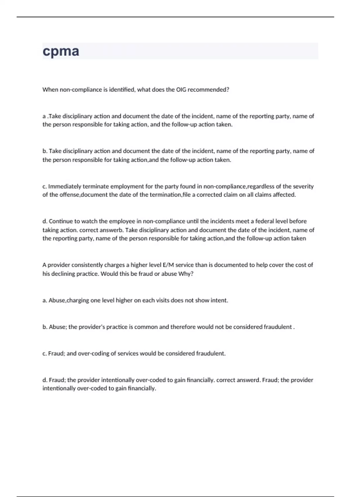 When non-compliance is identified, what does the OIG recommended? a .Take disciplinary action and document the date of the incident, name of the reporting party, name of the person responsible for taking action, and the follow-up action taken. b. Take disciplinary action and document the date of the incident, name of the reporting party, name of the person responsible for taking action,and the follow-up action taken. c. Immediately terminate employment for the party found in non-compliance,regardless of the severity of the offense,document the date of the termination,file a corrected claim on all claims affected. d. Continue to watch the employee in non-compliance until the incidents meet a federal level before taking action. b. Take disciplinary action and document the date of the incident, name of the reporting party, name of the person responsible for taking action,and the follow-up action taken A provider consistently charges a higher level E/M service than is documented to help cover the cost of his declining practice. Would this be fraud or abuse Why? a. Abuse,charging one level higher on each visits does not show intent. b. Abuse; the provider's practice is common and therefore would not be considered fraudulent . c. Fraud; and over-coding of services would be considered fraudulent. d. Fraud; the provider intentionally over-coded to gain financially. d. Fraud; the provider intentionally over-coded to gain financially.