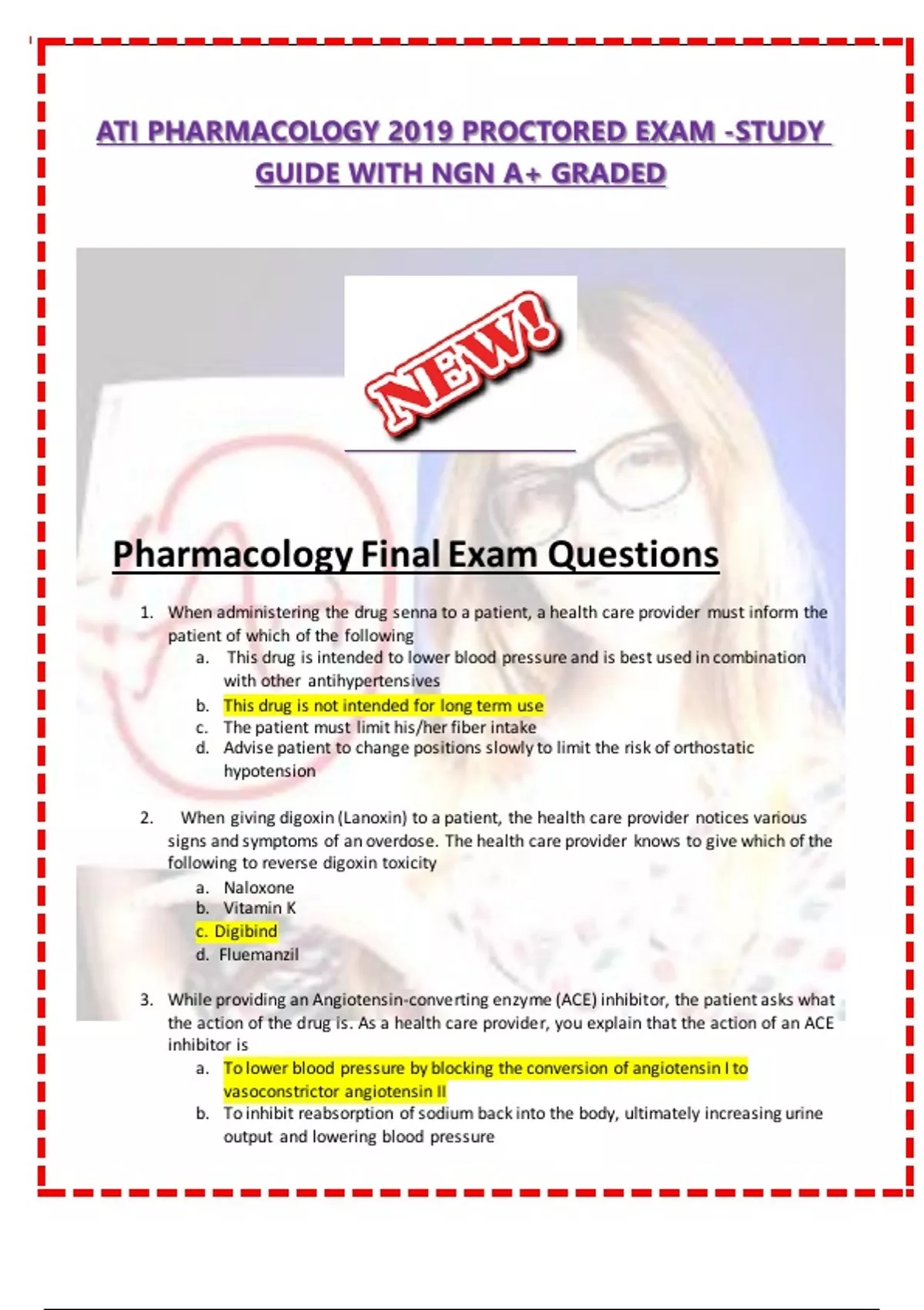 ATI PHARMACOLOGY 2019 PROCTORED EXAM -STUDY GUIDE WITH NGN A+ GRADED Pharmacology Final Exam Questions 1. When administering the drug senna to a patient, a health care provider must inform the patient of which of the following a. This drug is intended to lower blood pressure and is best used in combination with other antihypertensives b. This drug is not intended for long term use c. The patient must limit his/her fiber intake d. Advise patient to change positions slowly to limit the risk of orthostatic hypotension 2. When giving digoxin (Lanoxin) to a patient, the health care provider notices various signs and symptoms of an overdose. The health care provider knows to give which of the following to reverse digoxin toxicity a. Naloxone b. Vitamin K c. Digibind d. Fluemanzil 3. While providing an Angiotensin-converting enzyme (ACE) inhibitor, the patient asks what the action of the drug is. As a health care provider, you explain that the action of an ACE inhibitor is a. To lower blood pressure by blocking the conversion of angiotensin I to vasoconstrictor angiotensin II b. To inhibit reabsorption of sodium back into the body, ultimately increasing urine output and lowering blood pressure c. To decrease heart rate and blood pressure by competing with Beta1 and Beta2 receptors in the heart and lungs d. To lower blood glucose by stimulating the release of insulin 4. Which of the following types of insulin is “long-acting”? a. Lispro (Humalog) b. NPH (Humulin N) c. Regular insulin (Humulin R) d. Glargine (Lantus) 1. What is the therapeutic use of metformin? A. Lower blood pressure. B. To diminish seizure activity. C. The maintenance of a person’s blood glucose. D. Increase heart rate and decrease gastrointestinal secretions. 1. What is the correct definition for absorption of a drug? A. Movement of drug from site of administration to various tissues of the body. B. Describes the absorption, distribution, metabolism & excretion of drugs. C. These types of drugs can be taken over the counter. D. This addresses how various drugs affect different forms of the body. 2. What do you assess for in a patient who is on Valproate? Select all that apply. A. Suicidal thoughts B. Monitor for seizures. C. Bipolar disorder. D. Migraines. 3. What is true about food and drug precautions? Select all that apply. A. You must limit certain types of food or concurrent administration of certain types of drugs. B. Certain combinations of food and drugs can cause adverse reactions. C. Precautions may require limiting certain types of food or concurring drugs rather than restricting the drug itself. D. When one drug changes the way, another drug affects that drug. 1. ACE Inhibitors are used in the treatment of all EXCEPT: a. Hypertension b. Heart Failure c. Hypotension d. Diabetic nephropathy 2. Which of the following is used to treat migraine headaches? a. Beta-blockers b. Cholinesterase Inhibitors c. ACE inhibitors d. Anti-epileptic drugs (AEDs) 3. When administering a Serotonin Antagonist it is important to monitor for a. Intake and output b. Mental status changes c. Respiratory rate d. Anorexia 4. Which of the following is the antidote for Heparin? a. Protamine sulfate b. Vitamin K c. Naloxone d. Toradol