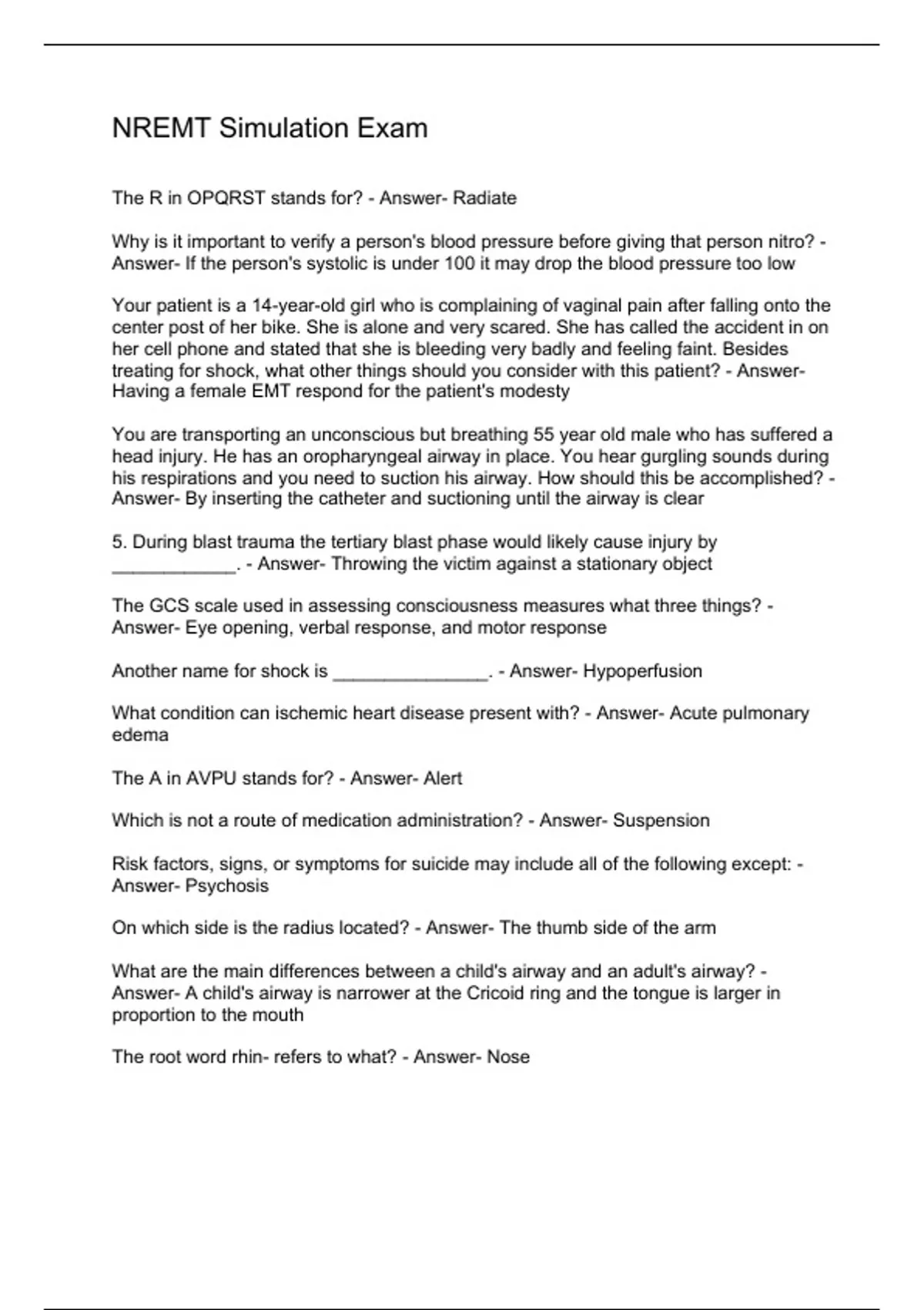 The R in OPQRST stands for? - Answer- Radiate Why is it important to verify a person's blood pressure before giving that person nitro? - Answer- If the person's systolic is under 100 it may drop the blood pressure too low Your patient is a 14-year-old girl who is complaining of vaginal pain after falling onto the center post of her bike. She is alone and very scared. She has called the accident in on her cell phone and stated that she is bleeding very badly and feeling faint. Besides treating for shock, what other things should you consider with this patient? - Answer- Having a female EMT respond for the patient's modesty You are transporting an unconscious but breathing 55 year old male who has suffered a head injury. He has an oropharyngeal airway in place. You hear gurgling sounds during his respirations and you need to suction his airway. How should this be accomplished? - Answer- By inserting the catheter and suctioning until the airway is clear 5. During blast trauma the tertiary blast phase would likely cause injury by ____________. - Answer- Throwing the victim against a stationary object The GCS scale used in assessing consciousness measures what three things? - Answer- Eye opening, verbal response, and motor response Another name for shock is _______________. - Answer- Hypoperfusion What condition can ischemic heart disease present with? - Answer- Acute pulmonary edema The A in AVPU stands for? - Answer- Alert Which is not a route of medication administration? - Answer- Suspension Risk factors, signs, or symptoms for suicide may include all of the following except: - Answer- Psychosis On which side is the radius located? - Answer- The thumb side of the arm What are the main differences between a child's airway and an adult's airway? - Answer- A child's airway is narrower at the Cricoid ring and the tongue is larger in proportion to the mouth The root word rhin- refers to what? - Answer- Nose Planning your message in advance before making a radio transmission will make it: - Answer- More clear and precise