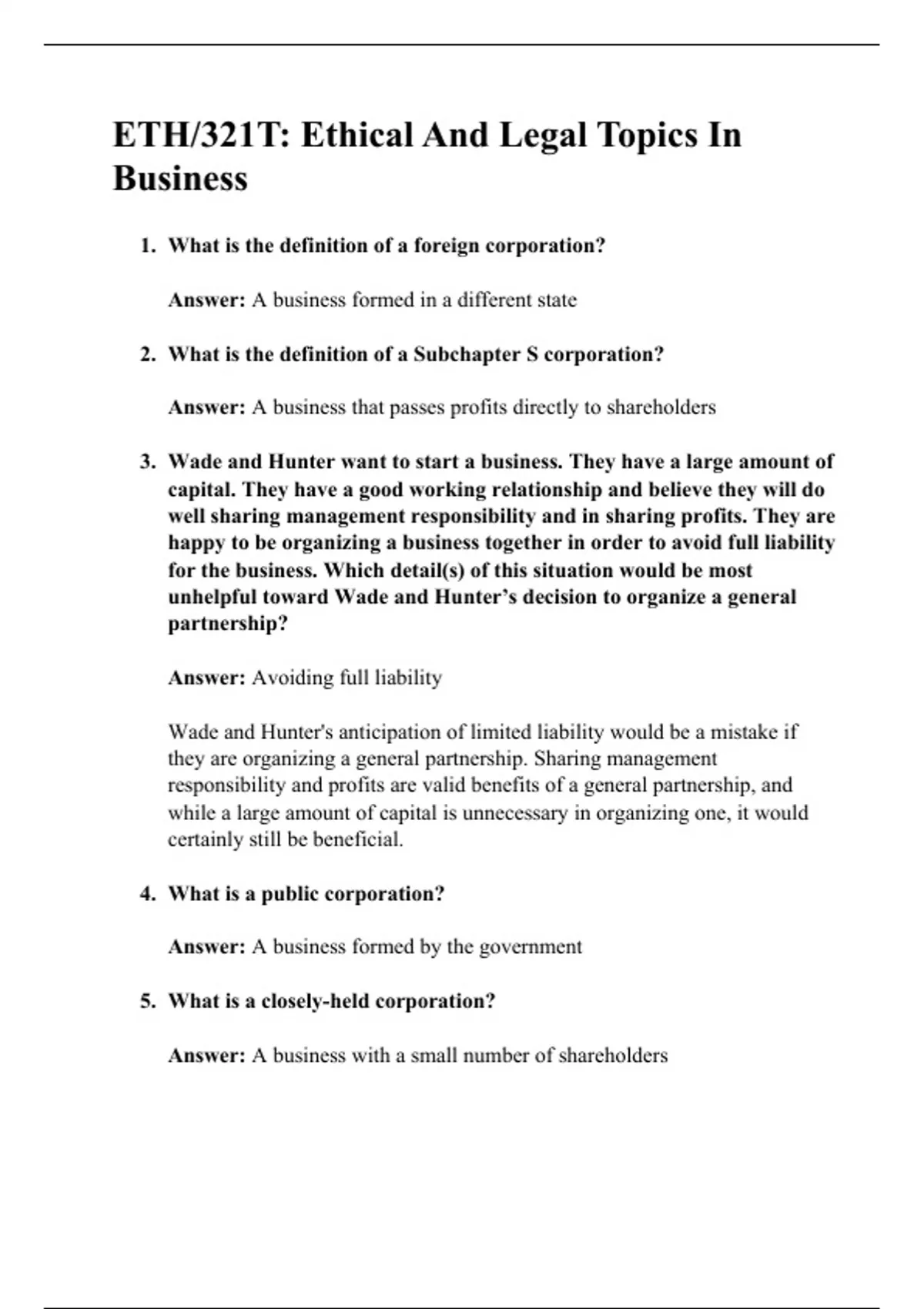 eth321t ethical and legal topics in business 1 what is the definition of a foreign corporation answer a business formed in a different state 2 what is the definition of a subchapter s corpora