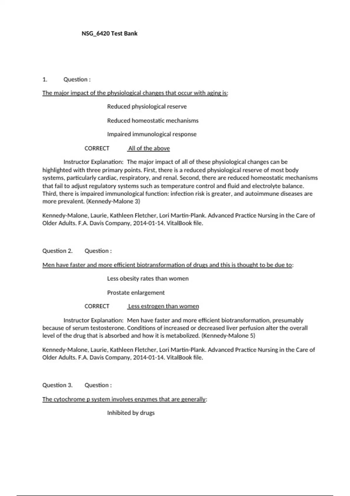 NSG_6420 Test Bank. 1. Question : The major impact of the physiological changes that occur with aging is: Reduced physiological reserve Reduced homeostatic mechanisms Impaired immunological response CORRECT All of the above Instructor Explanation: The major impact of all of these physiological changes can be highlighted with three primary points. First, there is a reduced physiological reserve of most body systems, particularly cardiac, respiratory, and renal. Second, there are reduced homeostatic mechanisms that fail to adjust regulatory systems such as temperature control and fluid and electrolyte balance. Third, there is impaired immunological function: infection risk is greater, and autoimmune diseases are more prevalent. (Kennedy-Malone 3) Kennedy-Malone, Laurie, Kathleen Fletcher, Lori Martin-Plank. Advanced Practice Nursing in the Care of Older Adults. F.A. Davis Company, . VitalBook file. Question 2. Question : Men have faster and more efficient biotransformation of drugs and this is thought to be due to: Less obesity rates than women Prostate enlargement CORRECT Less estrogen than women Instructor Explanation: Men have faster and more efficient biotransformation, presumably because of serum testosterone. Conditions of increased or decreased liver perfusion alter the overall level of the drug that is absorbed and how it is metabolized. (Kennedy-Malone 5) Kennedy-Malone, Laurie, Kathleen Fletcher, Lori Martin-Plank. Advanced Practice Nursing in the Care of Older Adults. F.A. Davis Company, . VitalBook file. Question 3. Question : The cytochrome p system involves enzymes that are generally: Inhibited by drugs South University NSG6420 2 Induced by drugs CORRECT Inhibited or induced by drugs Associated with decreased liver perfusion Instructor Explanation: Biotransformation occurs in all body tissues but primarily in the liver, where enzymatic activity (cytochrome P [CYP] system) alters and detoxifies the drug and prepares it for excretion. (Kennedy-Malone 5) Kennedy-Malone, Laurie, Kathleen Fletcher, Lori Martin-Plank. Advanced Practice Nursing in the Care of Older Adults. F.A. Davis Company, . VitalBook file. Question 4. Question : Functional abilities are best assessed by: Self-report of function CORRECT Observed assessment of function A comprehensive head-to-toe examination Family report of function Instructor Explanation: Two well-established tools used to evaluate function in older adults are the Katz Activities of Daily Living Scale (Katz et al., 1963) and the Lawton and Brody scale for Instrumental Activities of Daily Living (Lawton & Brody, 1969). It is important to be cautious about selfreport of function (rather than direct observation of function) and to ask, “Do you …?” instead of “Can you …?” in order to determine if patients actually perform the activity. (Kennedy-Malone 40) Kennedy-Malone, Laurie, Kathleen Fletcher, Lori Martin-Plank. Advanced Practice Nursing in the Care of Older Adults. F.A. Davis Company, . VitalBook file. Question 5. Question : Iron Deficiency Anemia (IDA) is classified as a microcytic, hypochromic anemia. This classification refers to which of the following laboratory data? Hemoglobin and Hematocrit CORRECT Mean Corpuscular Volume (MCV) and Mean Corpuscular Hemoglobin (MCH) Serum ferritin and serum iron Total iron binding capacity and transferrin saturation South University NSG6420 3 Instructor Explanation: RBC indices reveal an MCV (mean corpuscular volume/RBC size) that will be decreased to <80 fL in adults; MCH (mean corpuscular hemoglobin/RBC color) will show hypochromia or pale cells; RBC distribution width (RDW)/volume variation will be increased. (Kennedy-Malone page 519) Kennedy-Malone, Laurie, Kathleen Fletcher, Lori Martin-Plank. Advanced Practice Nursing in the Care of Older Adults. F.A. Davis Company, . VitalBook file. Question 6. Question : When interpreting laboratory data, you would expect to see the following in a patient with Anemia of Chronic Disease (ACD): Hemoglobin <12 g/dl, MCV decreased, MCH decreased Hemoglobin >12 g/dl, MCV increased, MCH increased CORRECT Hemoglobin <12 g/dl, MCV normal, MCH normal Hemoglobin >12 g/dl, MCV decreased, MCH increased Instructor Explanation: Hemoglobin (Hgb): <12 g/dL (120 g/L) women <13 g/dL (130 g/L) men Rarely <10 g/dL (100 g/L) Mean corpuscular volume: 80–96 mcm3 (normocytic) Mean corpuscular hemoglobin Normochromic (normal color) RBC distribution width: normal (Kennedy-Malone page 517) Kennedy-Malone, Laurie, Kathleen Fletcher, Lori Martin-Plank. Advanced Practice Nursing in the Care of Older Adults. F.A. Davis Company, . VitalBook file. Question 7. Question : The pathophysiological hallmark of ACD is: Depleted iron stores CORRECT Impaired ability to use iron stores Chronic uncorrectable bleeding Reduced intestinal absorption of iron Instructor Explanation: The pathophysiological hallmark of ACD is a disregulation of iron homeostasis, characterized by an increased uptake and retention of iron within the cells of the reticuloendothelial system (liver/spleen), resulting in decreased RBC production. Essentially, iron is present but inaccessible for use in the production of Hgb with the erythrocytes (Bross et al., 2010). A shortened RBC survival is also a contributing factor to ACD. (Kennedy-Malone page 516-517) South University NSG6420 4 Kennedy-Malone, Laurie, Kathleen Fletcher, Lori Martin-Plank. Advanced Practice Nursing in the Care of Older Adults. F.A. Davis Company, . VitalBook file. Question 8. Question : The main focus of treatment of patients with ACD is: Replenishing iron stores Providing for adequate nutrition high in iron CORRECT Management of the underlying disorder Administration of monthly vitamin B12 injections Instructor Explanation: Treatment: Treatment of ACD focuses on management of the underlying disorder. Iron supplementation is of no benefit in ACD, except in cases of coexisting IDA. A therapeutic trial of iron supplementation of no longer than 1 month 
