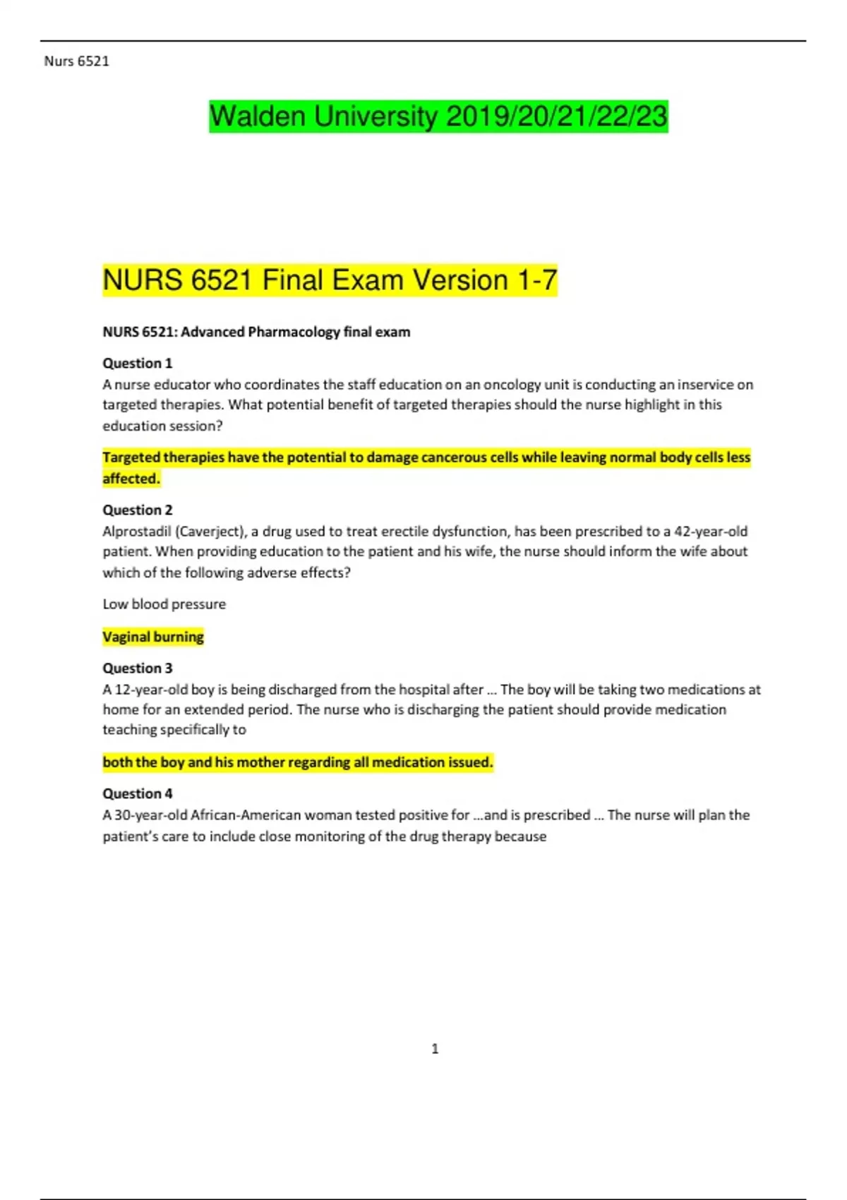 Walden University 2019/20/21/22/23 NURS 6521 Final Exam Version 1-7 NURS 6521: Advanced Pharmacology final exam Question 1 A nurse educator who coordinates the staff education on an oncology unit is conducting an inservice on targeted therapies. What potential benefit of targeted therapies should the nurse highlight in this education session? Targeted therapies have the potential to damage cancerous cells while leaving normal body cells less affected. Question 2 Alprostadil (Caverject), a drug used to treat erectile dysfunction, has been prescribed to a 42-year-old patient. When providing education to the patient and his wife, the nurse should inform the wife about which of the following adverse effects? Low blood pressure Vaginal burning Question 3 A 12-year-old boy is being discharged from the hospital after … The boy will be taking two medications at home for an extended period. The nurse who is discharging the patient should provide medication teaching specifically to both the boy and his mother regarding all medication issued. Question 4 A 30-year-old African-American woman tested positive for …and is prescribed … The nurse will plan the patient’s care to include close monitoring of the drug therapy because the patient is at greater risk for high serum levels of the drug. Question 6 A 16-year-old boy is prescribed cromolyn sodium nasal spray to treat a nasal allergy. To maximize the therapeutic effects of the drug, which of the following will the nurse include in instructions to the patient? Take the drug for 1 full week before coming in contact with allergens. Question 7 Laboratory testing has confirmed that a patient has chloroquine-resistant malaria and the patient’s physician has prescribed quinine along with an adjunctive drug. The nurse should question the physician’s order if the patient has a history of cardiac arrhythmias. Question 8 A nurse is explaining to a pregnant 21-year-old college student why she cannot continue to take ibuprofen (Advil) for her headaches. The nurse draws a picture depicting drug molecules crossing the drugs compete with the hormones of pregnancy for albumin-binding sites. Question 9 66-year-old man has made an appointment with his primary care provider to discuss his recent …and has requested a prescription for …based on television commercials he has seen. What characteristic of this patient would most likely contraindicate the use of The patient has unstable angina and uses a nitroglycerin patch Question 10 A man has a demonstrated history of androgen deficiency and the consequences of this health problem include an inability to maintain an erection. Which of the following medications would best address this patient’s erectile dysfunction (ED)? Exogenous testosterone Question 11 A 39-year-old woman is receiving doxorubicin for the treatment of cancer. After each treatment, the patient has acute nausea and vomiting accompanied by a slightly increased heart rate. The nurse will advise her to perform relaxation techniques after the treatments. Question 12 A nurse has administered filgrastim to a diverse group of patients in recent months. Which of the following patients should the nurse observe for extremely elevated white blood cell counts following administration of the drug? A 19-year-old Male receiving radiation therapy Question 13 A patient is taking flavoxate hydrochloride (Urispas) to help control an overactive bladder. On a follow-up visit to the clinic, the nurse will question the patient about which of the following? Dental hygiene practices Question 17 A female patient is taking filgrastim (Neupogen) to decrease the incidence of infection. The nurse notices a small increase in the neutrophil count 2 days after starting therapy. The nurse’s evaluation of the increase is that the increase in the neutrophil count is only transient. Question 18 A 2-year-old child is diagnosed with a minor ailment and is to be administered medications at home for 2 weeks. The child lives with his mother, grandmother, and four other children between the ages of 14 months and 7 years. The home health nurse is asked to assess the home environment to determine if it is appropriate for the child to take his medication at home. Which of the following will have the greatest impact on the nurse’s assessment? Where the medication will be stored Question 19 A nurse who provides care on a pediatric unit of a hospital is aware that the potential for harm as a result of drug errors is higher among infants and children than adults. This fact is primarily due to Immature liver and kidney function in infants and children. Question 20 A nurse is caring for a 46-year-old female patient who is taking paclitaxel for ovarian cancer. Two or three days after the infusion of the drug, the nurse must closely monitor for which of the following? Neurotoxicity Question 21 A 15-year-old boy who has been taking dextroamphetamine for the treatment of ADHD has been experiencing a depressed mood and a sense of hopelessness. He confides in the school nurse that he has begun taking his stepfather’s antidepressant to improve his mood. After immediately phoning the boy’s stepfather, the nurse learns that the drug in question is phenelzine (Nardil), a monoamine oxidase inhibitor (MAOI). The nurse should recognize that this combination of drugs creates a serious risk of what health problem? Hypertensive crisis Question 22 A 7-year-old child has been taking tetracycline for a bacterial infection. The nurse will be sure to inform the parents that this drug could cause orange-tinged urine. staining of permanent teeth. sleep deprivation. deep muscle pain. Question 23 Mr. Laird is a 49-year-old electrician who experienced severe burns on his trunk, arms, and hands in a workplace accident 2 weeks ago. Part of his .. Apply a layer of silver sulfadiazine that is sufficiently thick to make the wound bed invisible. Cleanse the wound of debris prior to applying the silver sulfadiazine