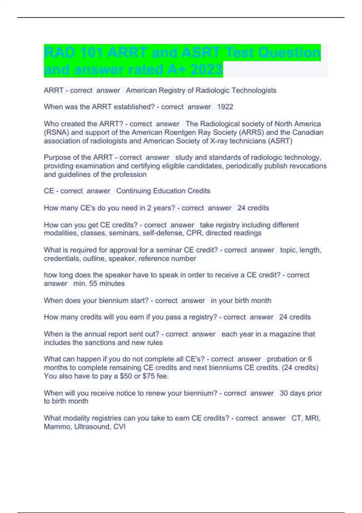 RAD 101 ARRT and ASRT Test Question and answer rated A+ 2023ARRT American Registry of Radiologic Technologists When was the ARRT established? 1922 Who created the ARRT? The Radiological society of North America (RSNA) and support of the American Roentgen Ray Society (ARRS) and the Canadian association of radiologists and American Society of X-ray technicians (ASRT) Purpose of the ARRT study and standards of radiologic technology, providing examination and certifying eligible candidates, periodically publish revocations and guidelines of the profession CE Continuing Education Credits How many CE's do you need in 2 years? 24 credits How can you get CE credits? take registry including different modalities, classes, seminars, self-defense, CPR, directed readings What is required for approval for a seminar CE credit? topic, length, credentials, outline, speaker, reference number how long does the speaker have to speak in order to receive a CE credit? min. 55 minutes When does your biennium start? in your birth month How many credits will you earn if you pass a registry? 24 credits When is the annual report sent out? each year in a magazine that includes the sanctions and new rules What can happen if you do not complete all CE's? probation or 6 months to complete remaining CE credits and next bienniums CE credits. (24 credits) You also have to pay a $50 or $75 fee. When will you receive notice to renew your biennium? 30 days prior to birth month What modality registries can you take to earn CE credits? CT, MRI, Mammo, Ultrasound, CVI What score do you have to receive to pass the registry? 75 or higher What is the ASRT responsible for? CE credits, assisting in developing job descriptions, guide for appropriate practice, promotes role definition for practitioners, RAD practice standards, works with legislations to improve our profession and patient care What are the registry content topics? Patient care, safety, image production, procedures