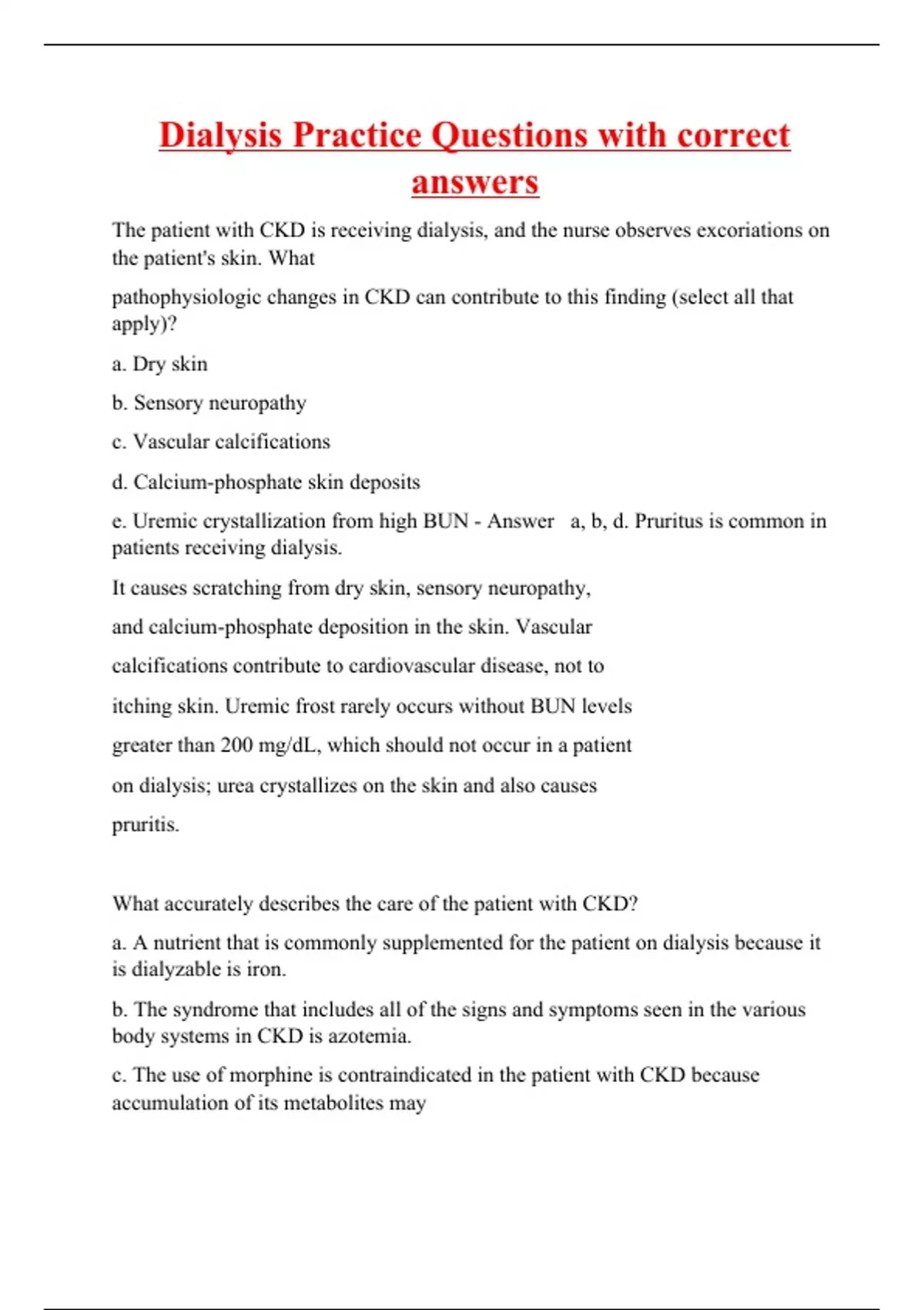 The patient with CKD is receiving dialysis, and the nurse observes excoriations on the patient's skin. What pathophysiologic changes in CKD can contribute to this finding (select all that apply)? a. Dry skin b. Sensory neuropathy c. Vascular calcifications d. Calcium-phosphate skin deposits e. Uremic crystallization from high BUN - Answer a, b, d. Pruritus is common in patients receiving dialysis. It causes scratching from dry skin, sensory neuropathy, and calcium-phosphate deposition in the skin. Vascular calcifications contribute to cardiovascular disease, not to itching skin. Uremic frost rarely occurs without BUN levels greater than 200 mg/dL, which should not occur in a patient on dialysis; urea crystallizes on the skin and also causes pruritis. What accurately describes the care of the patient with CKD? a. A nutrient that is commonly supplemented for the patient on dialysis because it is dialyzable is iron. b. The syndrome that includes all of the signs and symptoms seen in the various body systems in CKD is azotemia. c. The use of morphine is contraindicated in the patient with CKD because accumulation of its metabolites may