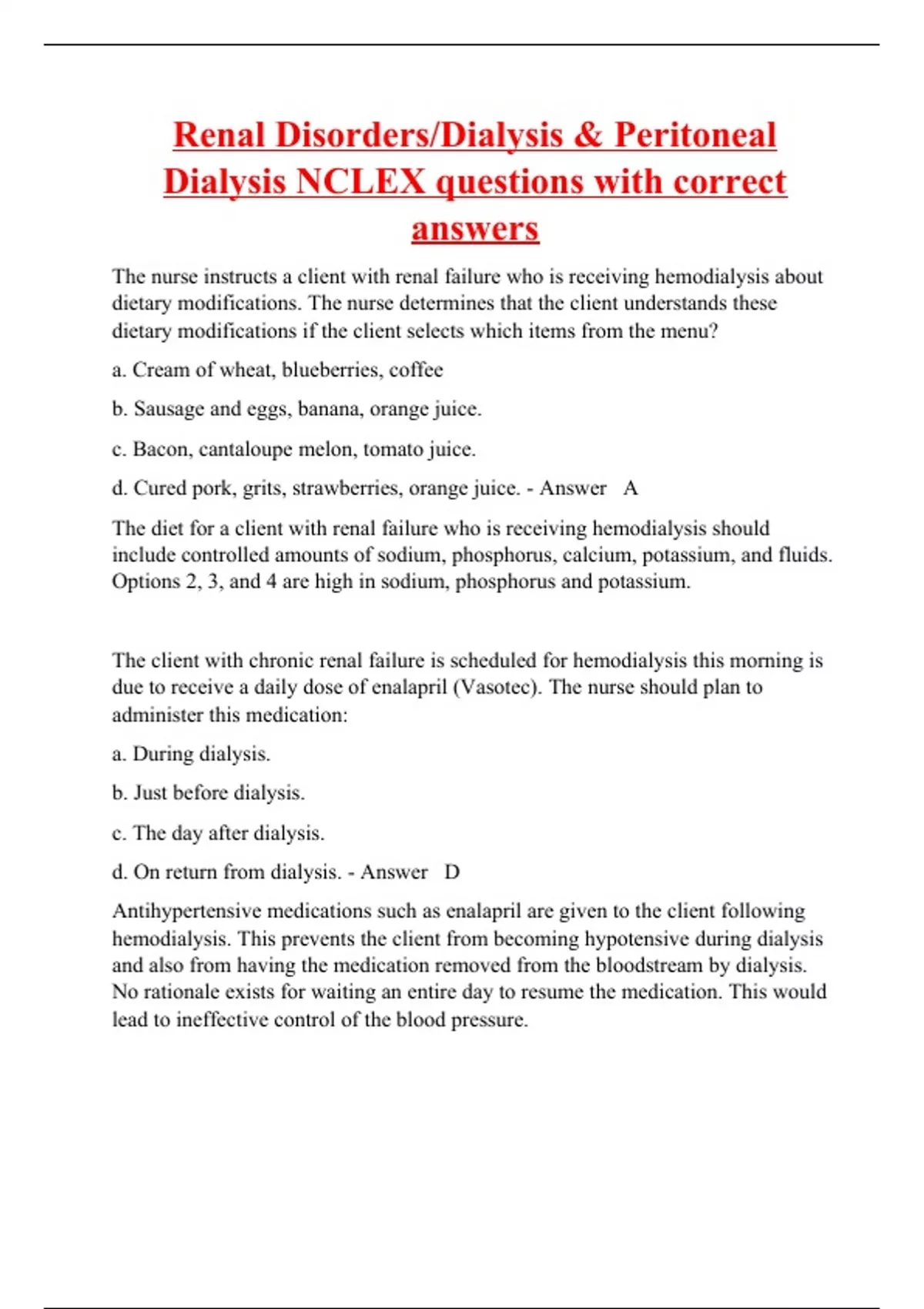 The nurse instructs a client with renal failure who is receiving hemodialysis about dietary modifications. The nurse determines that the client understands these dietary modifications if the client selects which items from the menu? a. Cream of wheat, blueberries, coffee b. Sausage and eggs, banana, orange juice. c. Bacon, cantaloupe melon, tomato juice. d. Cured pork, grits, strawberries, orange juice. - Answer A The diet for a client with renal failure who is receiving hemodialysis should include controlled amounts of sodium, phosphorus, calcium, potassium, and fluids. Options 2, 3, and 4 are high in sodium, phosphorus and potassium. The client with chronic renal failure is scheduled for hemodialysis this morning is due to receive a daily dose of enalapril (Vasotec). The nurse should plan to administer this medication: a. During dialysis. b. Just before dialysis. c. The day after dialysis. d. On return from dialysis. - Answer D Antihypertensive medications such as enalapril are given to the client following hemodialysis. This prevents the client from becoming hypotensive during dialysis and also from having the medication removed from the bloodstream by dialysis. No rationale exists for waiting an entire day to resume the medication. This would lead to ineffective control of the blood pressure.