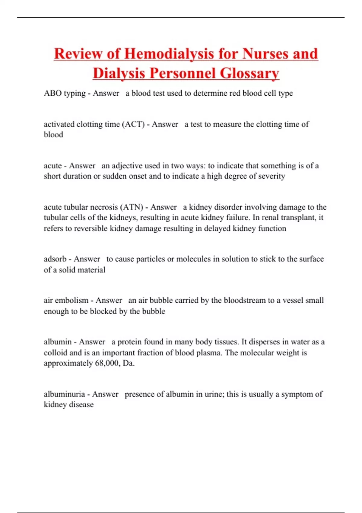 ABO typing - Answer a blood test used to determine red blood cell type activated clotting time (ACT) - Answer a test to measure the clotting time of blood acute - Answer an adjective used in two ways: to indicate that something is of a short duration or sudden onset and to indicate a high degree of severity acute tubular necrosis (ATN) - Answer a kidney disorder involving damage to the tubular cells of the kidneys, resulting in acute kidney failure. In renal transplant, it refers to reversible kidney damage resulting in delayed kidney function adsorb - Answer to cause particles or molecules in solution to stick to the surface of a solid material air embolism - Answer an air bubble carried by the bloodstream to a vessel small enough to be blocked by the bubble albumin - Answer a protein found in many body tissues. It disperses in water as a colloid and is an important fraction of blood plasma. The molecular weight is approximately 68,000, Da. albuminuria - Answer presence of albumin in urine; this is usually a symptom of kidney disease