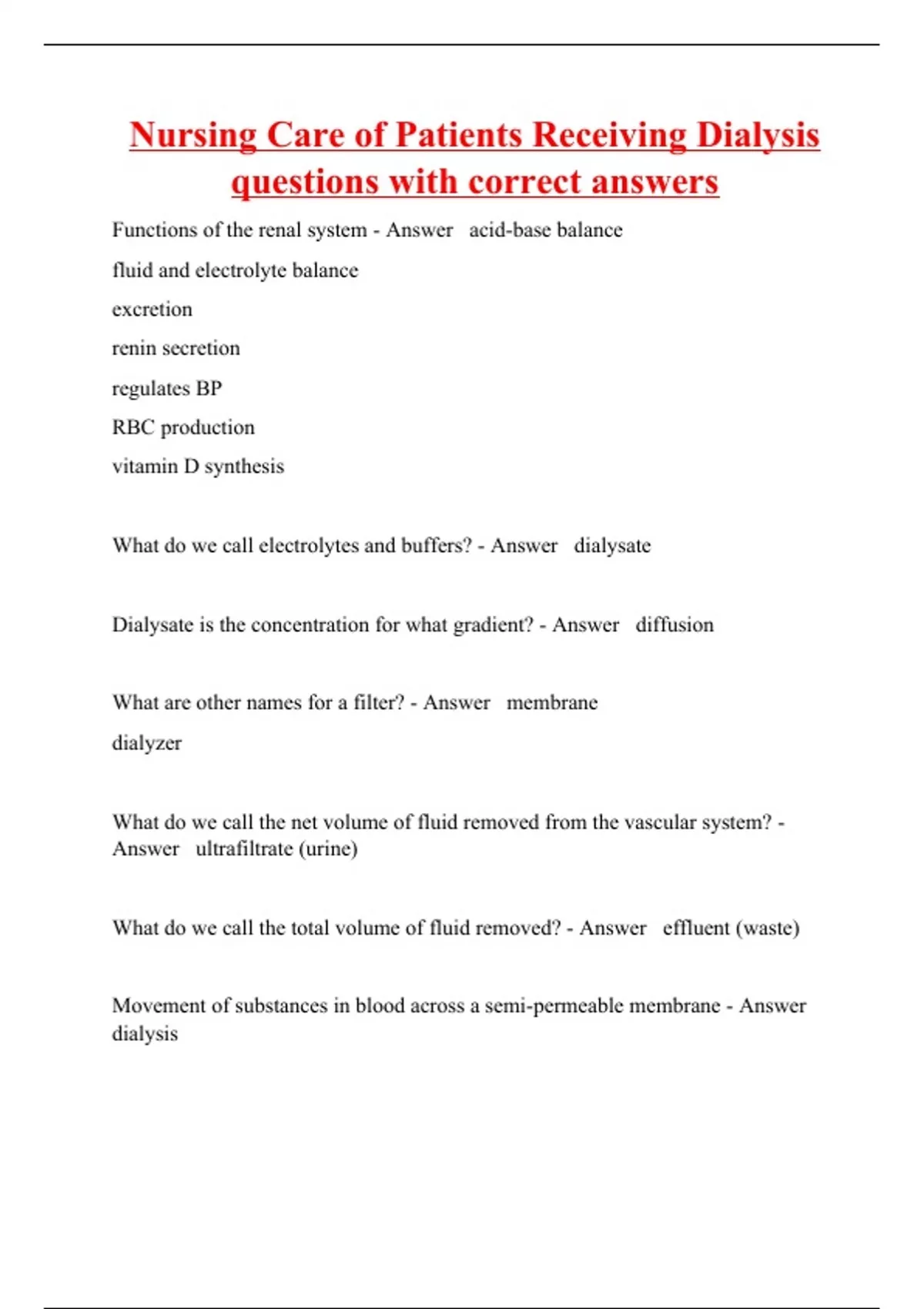 Functions of the renal system - Answer acid-base balance fluid and electrolyte balance excretion renin secretion regulates BP RBC production vitamin D synthesis What do we call electrolytes and buffers? - Answer dialysate Dialysate is the concentration for what gradient? - Answer diffusion What are other names for a filter? - Answer membrane dialyzer What do we call the net volume of fluid removed from the vascular system? - Answer ultrafiltrate (urine) What do we call the total volume of fluid removed? - Answer effluent (waste) Movement of substances in blood across a semi-permeable membrane - Answer dialysis