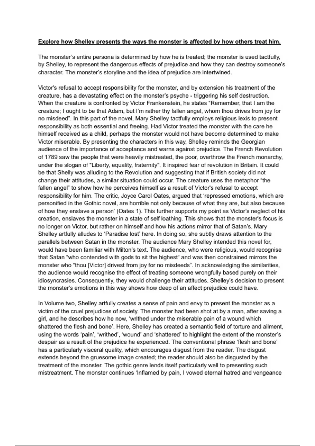 Grade 9 Essay - Explore how the monster is affected by how others treat him