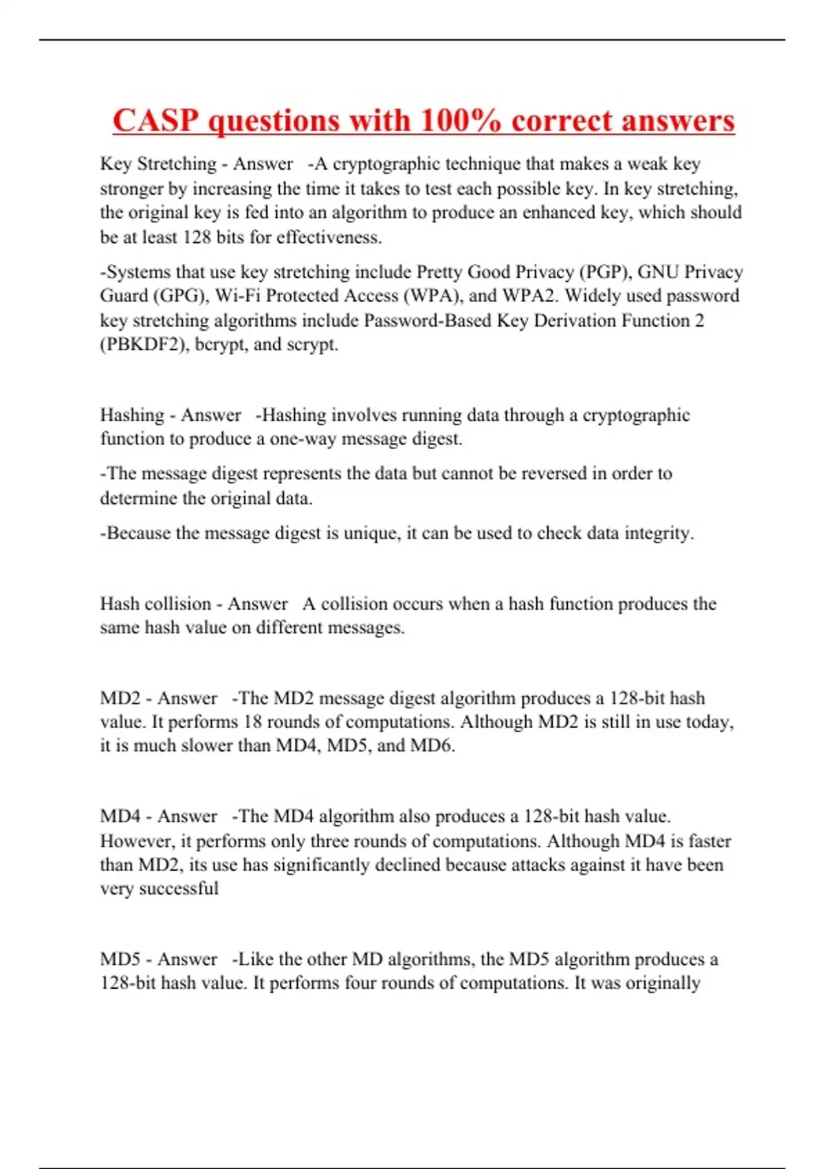 Key Stretching - Answer -A cryptographic technique that makes a weak key stronger by increasing the time it takes to test each possible key. In key stretching, the original key is fed into an algorithm to produce an enhanced key, which should be at least 128 bits for effectiveness. -Systems that use key stretching include Pretty Good Privacy (PGP), GNU Privacy Guard (GPG), Wi-Fi Protected Access (WPA), and WPA2. Widely used password key stretching algorithms include Password-Based Key Derivation Function 2 (PBKDF2), bcrypt, and scrypt. Hashing - Answer -Hashing involves running data through a cryptographic function to produce a one-way message digest. -The message digest represents the data but cannot be reversed in order to determine the original data. -Because the message digest is unique, it can be used to check data integrity. Hash collision - Answer A collision occurs when a hash function produces the same hash value on different messages. MD2 - Answer -The MD2 message digest algorithm produces a 128-bit hash value. It performs 18 rounds of computations. Although MD2 is still in use today, it is much slower than MD4, MD5, and MD6. MD4 - Answer -The MD4 algorithm also produces a 128-bit hash value. However, it performs only three rounds of computations. Although MD4 is faster than MD2, its use has significantly declined because attacks against it have been very successful MD5 - Answer -Like the other MD algorithms, the MD5 algorithm produces a 128-bit hash value. It performs four rounds of computations. It was originally created because of the issues with MD4, and it is more complex than MD4. However, MD5 is not collision free.