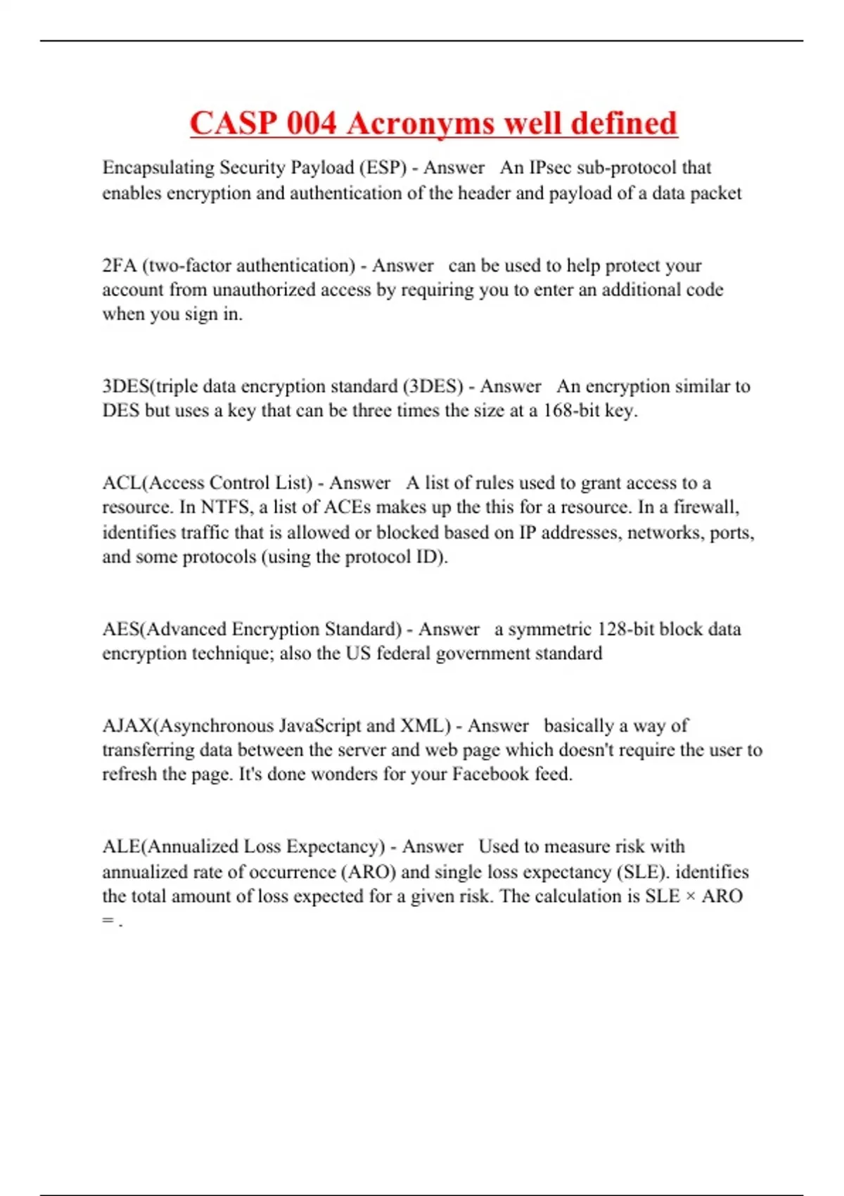 Encapsulating Security Payload (ESP) - Answer An IPsec sub-protocol that enables encryption and authentication of the header and payload of a data packet 2FA (two-factor authentication) - Answer can be used to help protect your account from unauthorized access by requiring you to enter an additional code when you sign in. 3DES(triple data encryption standard (3DES) - Answer An encryption similar to DES but uses a key that can be three times the size at a 168-bit key. ACL(Access Control List) - Answer A list of rules used to grant access to a resource. In NTFS, a list of ACEs makes up the this for a resource. In a firewall, identifies traffic that is allowed or blocked based on IP addresses, networks, ports, and some protocols (using the protocol ID). AES(Advanced Encryption Standard) - Answer a symmetric 128-bit block data encryption technique; also the US federal government standard AJAX(Asynchronous JavaScript and XML) - Answer basically a way of transferring data between the server and web page which doesn't require the user to refresh the page. It's done wonders for your Facebook feed. ALE(Annualized Loss Expectancy) - Answer Used to measure risk with annualized rate of occurrence (ARO) and single loss expectancy (SLE). identifies the total amount of loss expected for a given risk. The calculation is SLE × ARO = .