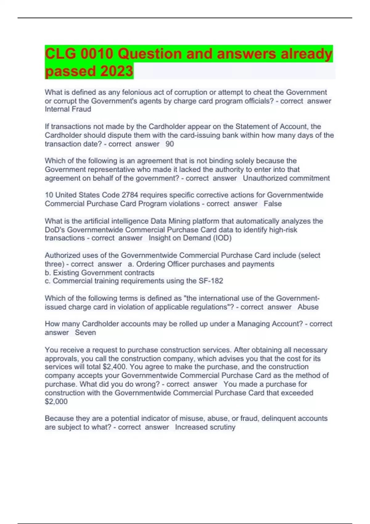 CLG 0010 Question and answers already passed 2023What is defined as any felonious act of corruption or attempt to cheat the Government or corrupt the Government's agents by charge card program officials? Internal Fraud If transactions not made by the Cardholder appear on the Statement of Account, the Cardholder should dispute them with the card-issuing bank within how many days of the transaction date? 90 Which of the following is an agreement that is not binding solely because the Government representative who made it lacked the authority to enter into that agreement on behalf of the government? Unauthorized commitment 10 United States Code 2784 requires specific corrective actions for Governmentwide Commercial Purchase Card Program violations False What is the artificial intelligence Data Mining platform that automatically analyzes the DoD's Governmentwide Commercial Purchase Card data to identify high-risk transactions Insight on Demand (IOD) Authorized uses of the Governmentwide Commercial Purchase Card include (select three) a. Ordering Officer purchases and payments b. Existing Government contracts c. Commercial training requirements using the SF-182 Which of the following terms is defined as "the international use of the Government-issued charge card in violation of applicable regulations"? Abuse How many Cardholder accounts may be rolled up under a Managing Account? Seven You receive a request to purchase construction services. After obtaining all necessary approvals, you call the construction company, which advises you that the cost for its services will total $2,400. You agree to make the purchase, and the construction company accepts your Governmentwide Commercial Purchase Card as the method of purchase. What did you do wrong? You made a purchase for construction with the Governmentwide Commercial Purchase Card that exceeded $2,000