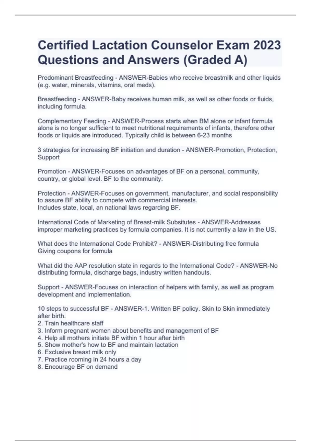 Certified Lactation Counselor Exam 2023 Questions and Answers (Graded A)Certified Lactation Counselor Exam 2023 Questions and Answers (Graded A)Certified Lactation Counselor Exam 2023 Questions and Answers (Graded A)Predominant Breastfeeding - ANSWER-Babies who receive breastmilk and other liquids (e.g. water, minerals, vitamins, oral meds). Breastfeeding - ANSWER-Baby receives human milk, as well as other foods or fluids, including formula. Complementary Feeding - ANSWER-Process starts when BM alone or infant formula alone is no longer sufficient to meet nutritional requirements of infants, therefore other foods or liquids are introduced. Typically child is between 6-23 months 3 strategies for increasing BF initiation and duration - ANSWER-Promotion, Protection, Support Promotion - ANSWER-Focuses on advantages of BF on a personal, community, country, or global level. BF to the community. Protection - ANSWER-Focuses on government, manufacturer, and social responsibility to assure BF ability to compete with commercial interests. Includes state, local, an national laws regarding BF. International Code of Marketing of Breast-milk Subsitutes - ANSWER-Addresses improper marketing practices by formula companies. It is not currently a law in the US. What does the International Code Prohibit? - ANSWER-Distributing free formula Giving coupons for formula What did the AAP resolution state in regards to the International Code? - ANSWER-No distributing formula, discharge bags, industry written handouts. Support - ANSWER-Focuses on interaction of helpers with family, as well as program development and implementation. 10 steps to successful BF - ANSWER-1. Written BF policy. Skin to Skin immediately after birth. 2. Train healthcare staff 3. Inform pregnant women about benefits and management of BF 4. Help all mothers initiate BF within 1 hour after birth 5. Show mother's how to BF and maintain lactation 6. Exclusive breast milk only 7. Practice rooming in 24 hours a day 8. Encourage BF on demand