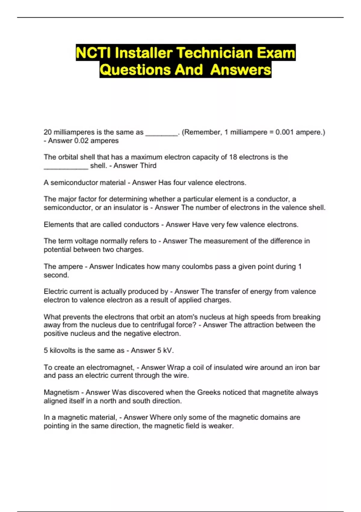 NCTI Installer Technician Exam Questions And Answers