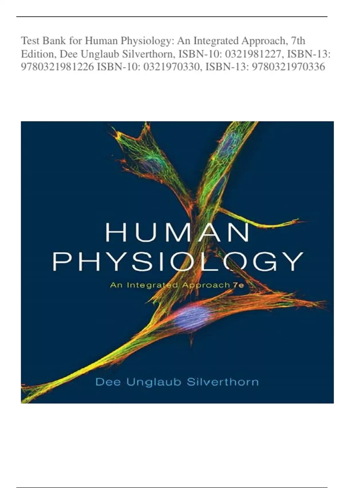 Test Bank for Human Physiology: An Integrated Approach, 7th Edition, Dee Unglaub Silverthorn, ISBN-10: 7, ISBN-13: 1226 ISBN-10: 0, ISBN-13: 0336 MULTIPLE CHOICE. Choose the one alternative that best completes the statement or answers the question. 1) Physiology is the study of 1) _______ A) growth and reproduction. B) the tissues and organs of the body at the microscopic level. C) the normal function of living organisms. D) the structure of the body. E) the facial features as an indication of personality. 2) The literal meaning of the term physiology is knowledge of 2) _______ A) science. B) chemistry. C) organs. D) math. E) nature. 3) Because anatomy and physiology have different definitions, they are usually considered separately in studies of the body. 3) _______ A) True B) False 4) The following is a list of several levels of organization that make up the human body. 1. tissue 2. cell 3. organ 4. molecule 5. organism 6. organ system The correct order from the smallest to the largest is 4) _______ A) 4, 2, 3, 1, 6, 5. B) 6, 4, 5, 2, 3, 1. C) 4, 2, 1, 6, 3, 5. D) 2, 4, 1, 3, 6, 5. E) 4, 2, 1, 3, 6, 5. 5) "Glucose is transported from blood into cells because cells require glucose to meet their energy needs." This type of explanation is 5) _______ A) metalogical. B) teleological. C) mechanistic. D) theological. E) scatological. 6) "Glucose is transported from blood into cells by transporters in response to insulin." This type of explanation is 6) _______ A) metalogical. B) mechanistic. C) theological. D) scatological. E) teleological. 7) Which of the following is a buffer zone between the outside world and most of the cells of the body? 7) _______ A) intracellular fluid B) red blood cells C) cell membrane D) extracellular fluid E) All of the answers are correct. 8) Which of the following is one of Cannon's "internal secretions"? 8) _______ A) water B) nutrients C) inorganic ions D) hormones E) None of the answers are correct. 9) The study of body function in a disease state is 9) _______ A) pathophysiology. B) physiology. C) microbiology. D) histology. E) necrology. 10) Homeostasis is the ability of the body to 10) ______ A) ignore external stimuli to remain in a state of rest. B) quickly restore changed conditions to normal. C) prevent excessive blood loss. D) prevent the external environment from changing. E) prevent the internal environment from changing. 11) Oxytocin is a hormone that is released in response to cervical dilation. It in turn causes more uterine contractions that will further dilate the cervix. Which type of feedback loop does oxytocin trigger? 11) ______ A) nociceptive feedback B) positive feedback C) local control D) negative feedback 12) How genetics influences the body's response to drugs is called 12) ______ A) pharmacodynamics. B) pharmacokinetics. C) pharmageddon. D) pharmacogenomics. E) pharmacogenetics.