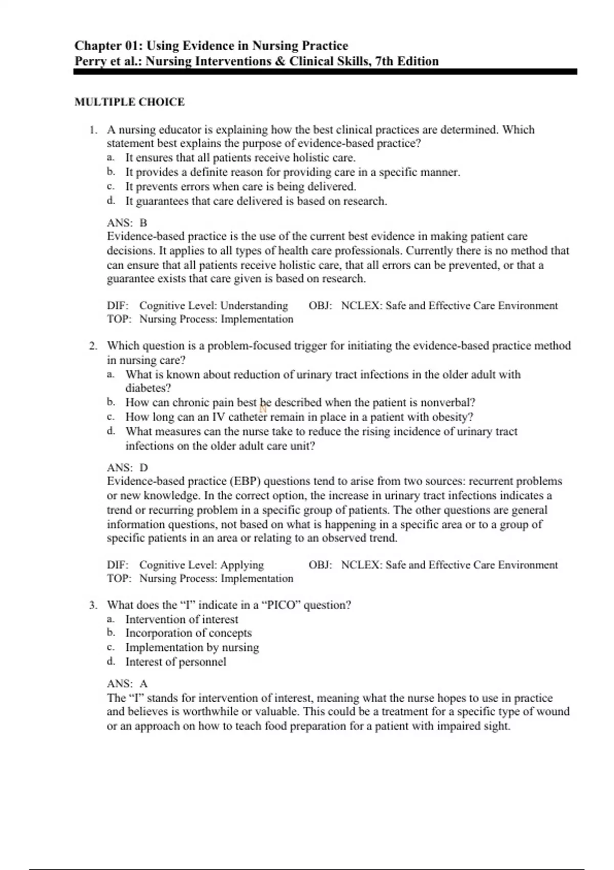 Nursing_Interventions and Clinical_Skills Q&A. 1. A nursing educator is explaining how the best clinical practices are determined. Which statement best explains the purpose of evidence-based practice? a. It ensures that all patients receive holistic care. b. It provides a definite reason for providing care in a specific manner. c. It prevents errors when care is being delivered. d. It guarantees that care delivered is based on research. ANS: B Evidence-based practice is the use of the current best evidence in making patient care decisions. It applies to all types of health care professionals. Currently there is no method that can ensure that all patients receive holistic care, that all errors can be prevented, or that a guarantee exists that care given is based on research. DIF: Cognitive Level: Understanding OBJ: NCLEX: Safe and Effective Care Environment TOP: Nursing Process: Implementation 2. Which question is a problem-focused trigger for initiating the evidence-based practice method in nursing care? a. What is known about reduction of urinary tract infections in the older adult with diabetes? b. How can chronic pain best be described when the patient is nonverbal? c. How long can an IV catheter remain in place in a patient with obesity? d. What measures can the nurse take to reduce the rising incidence of urinary tract infections on the older adult care unit? ANS: D Evidence-based practice (EBP) questions tend to arise from two sources: recurrent problems or new knowledge. In the correct option, the increase in urinary tract infections indicates a trend or recurring problem in a specific group of patients. The other questions are general information questions, not based on what is happening in a specific area or to a group of specific patients in an area or relating to an observed trend. DIF: Cognitive Level: Applying OBJ: NCLEX: Safe and Effective Care Environment TOP: Nursing Process: Implementation 3. What does the “I” indicate in a “PICO” question? a. Intervention of interest b. Incorporation of concepts c. Implementation by nursing d. Interest of personnel ANS: A The “I” stands for intervention of interest, meaning what the nurse hopes to use in practice and believes is worthwhile or valuable. This could be a treatment for a specific type of wound or an approach on how to teach food preparation for a patient with impaired sight. N DIF: Cognitive Level: Remembering OBJ: NCLEX: Safe and Effective Care Environment TOP: Nursing Process: Implementation 4. Who will the clinical research nurse contact to search relevant databases in preparation for an upcoming study? a. The physician whose patients may be involved in the study b. The medical librarian c. The nurse manager of the unit where the study will be conducted d. The director of nursing of the facility ANS: B The medical librarian is most knowledgeable regarding databases relevant to a study. The other individuals do not have the knowledge regarding relevant databases. DIF: Cognitive Level: Understanding OBJ: NCLEX: Safe and Effective Care Environment TOP: Nursing Process: Implementation 5. Which database contains summaries of clinical guidelines and their development? a. MEDLINE b. CINAHL c. Cochrane Database of Systematic Reviews d. The National Guideline Clearinghouse ANS: D The National Guideline Clearinghouse is a database supported by the Agency for Healthcare Research and Quality. It contains summaries of clinical guidelines for practice. MEDLINE is a database for studies in medicine, nursing, dentistry, psychiatry, veterinary medicine, and allied health. CINAHL (Cumulative Index of Nursing and Allied Health Literature) includes studies in nursing, allied health, and biomedicine. The Cochrane Database Full text of regularly updated systematic reviews prepared by the Cochrane Collaboration includes completed reviews and protocols. DIF: Cognitive Level: Remembering OBJ: NCLEX: Safe and Effective Care Environment TOP: Nursing Process: Implementation 6. Which does the nurse researcher identify as the strongest type of research? a. Randomized controlled trials b. A qualitative study c. A descriptive study d. A case controlled study ANS: A Individual randomized controlled trials are close to the top of the research pyramid. Only systematic reviews and meta-analyses are higher. This type of study tests an intervention against the usual standard of care. The other types of studies are useful but do not give the same type of information as a randomized controlled trial provides. DIF: Cognitive Level: Remembering OBJ: NCLEX: Safe and Effective Care Environment TOP: Nursing Process: Assessment N 7. What is the nurse attempting to determine when critiquing the evidence related to a PICOT question? a. The ethical conduct of the research the nurse read b. The strength of the evidence found in the literature c. If there are any experts in the clinical question needing to be researched d. If the study demonstrates cost-effectiveness if a change in practice occurs ANS: B Once a literature search is complete and data are gathered about the question, it is time to critique the evidence. Critiquing the evidence involves a systematic approach to looking at the strength of the work reviewed and its relevance. The other questions are not applicable to critiquing the evidence. DIF: Cognitive Level: Understanding OBJ: NCLEX: Safe and Effective Care Environment TOP: Nursing Process: Implementation 8. A nurse finds a cohort study comparing one group taking hormone treatment with another group not taking hormone treatment to determine the incidence of changes in bone density of the lower spine. What can the nurse imply from this study? a. Low level of strength makes the study limited in value. b. Moderate level of strength makes the study probably useful. c. Opinions of the individuals in the cohort are not research. d. This could be the basis for a Quality Improvement project. ANS: B A cohort study is Level 4 evidence as it is a single