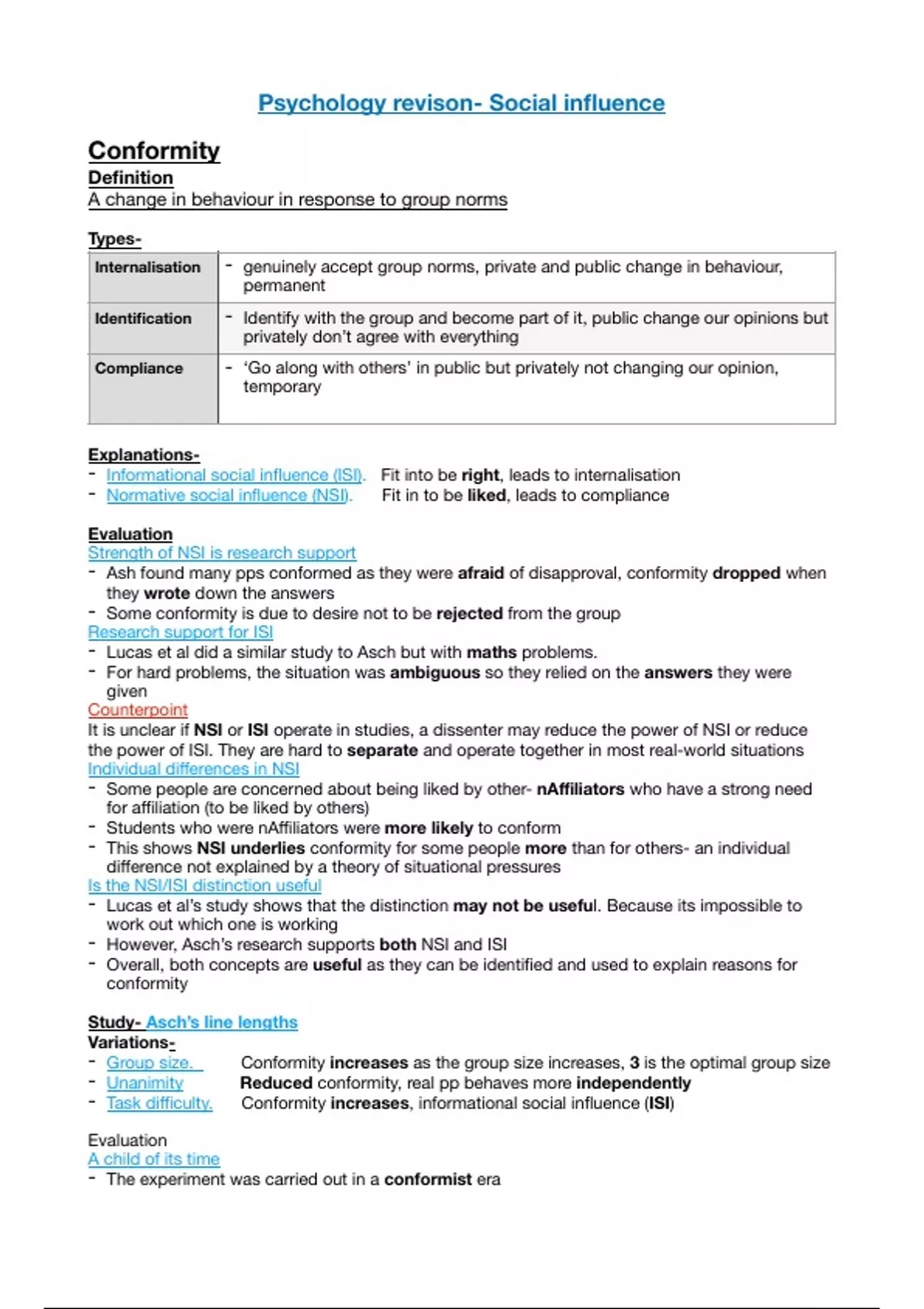This document provides a summary of social influence for AQA Psychology A Level. I achieved an A* using these revision notes.