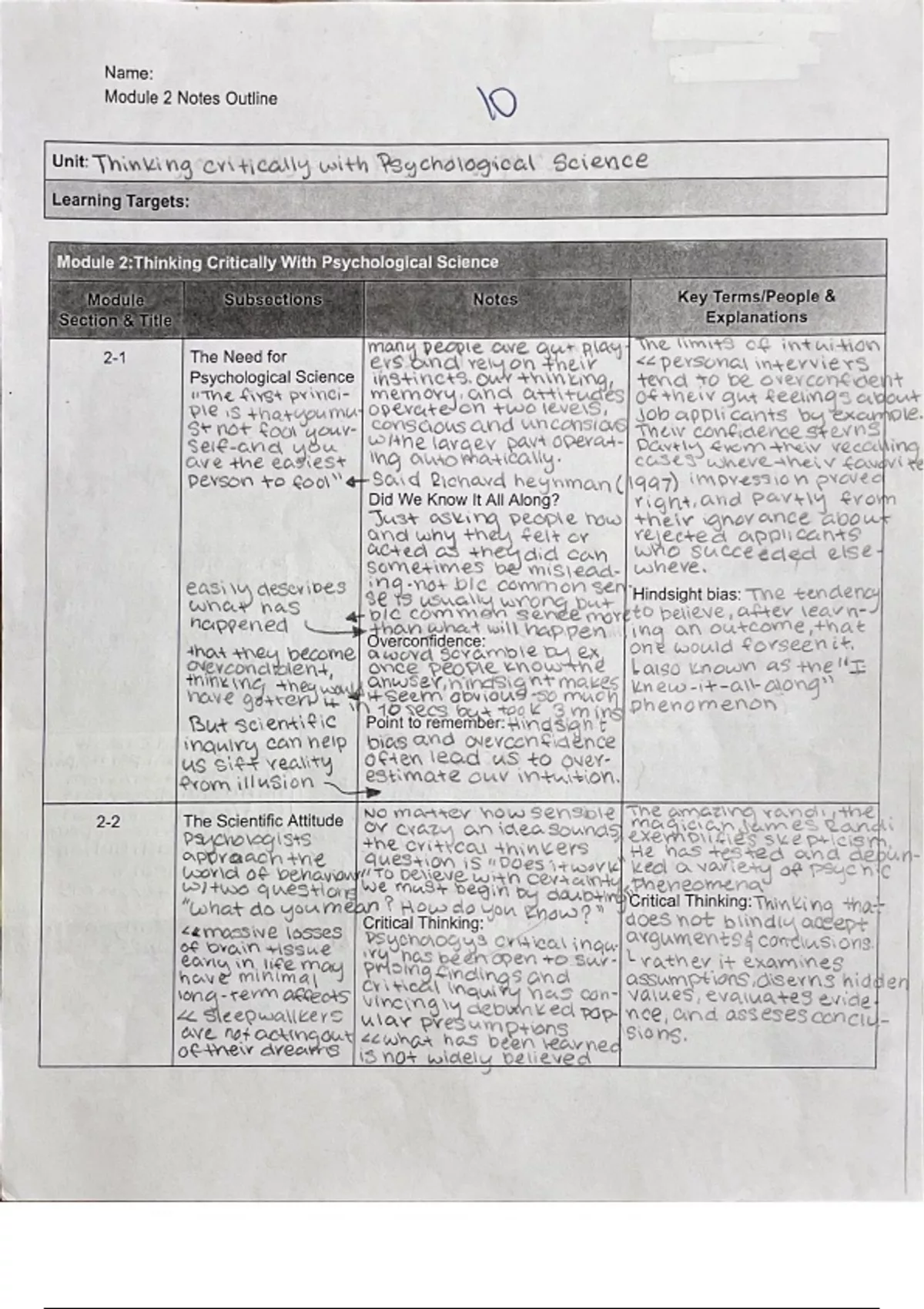 Thinking critically with Psychological science, subsections, notes, key people/terms, examples, explanations, summary, extra notes.