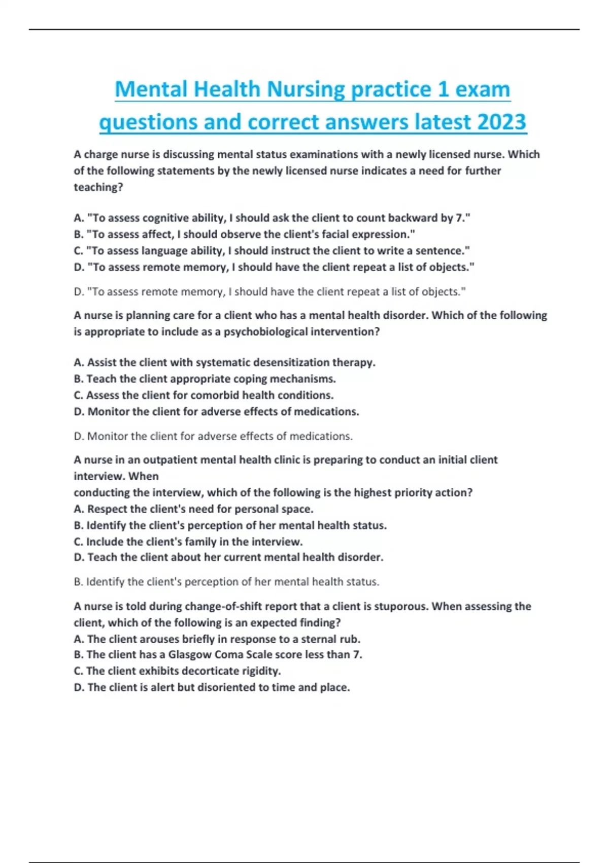 Mental Health Nursing practice 1 exam questions and correct answers latest 2023