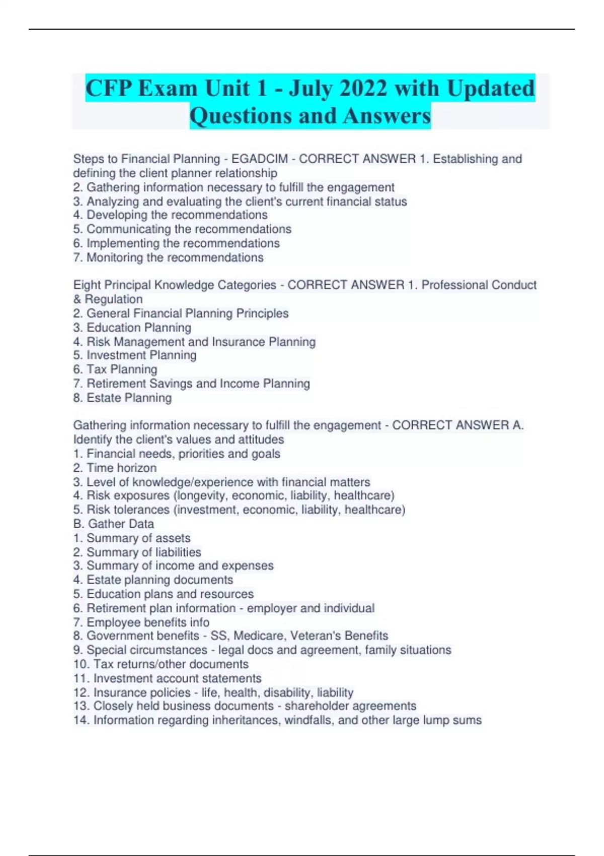 CFP Exam Unit 1 - July 2022 with Updated Questions and Answers Steps to Financial Planning - EGADCIM - CORRECT ANSWER 1. Establishing and defining the client planner relationship 2. Gathering information necessary to fulfill the engagement 3. Analyzing and evaluating the client's current financial status 4. Developing the recommendations 5. Communicating the recommendations 6. Implementing the recommendations 7. Monitoring the recommendations Eight Principal Knowledge Categories - CORRECT ANSWER 1. Professional Conduct & Regulation 2. General Financial Planning Principles 3. Education Planning 4. Risk Management and Insurance Planning 5. Investment Planning 6. Tax Planning 7. Retirement Savings and Income Planning 8. Estate Planning Gathering information necessary to fulfill the engagement - CORRECT ANSWER A. Identify the client's values and attitudes 1. Financial needs, priorities and goals 2. Time horizon 3. Level of knowledge/experience with financial matters 4. Risk exposures (longevity, economic, liability, healthcare) 5. Risk tolerances (investment, economic, liability, healthcare) B. Gather Data 1. Summary of assets 2. Summary of liabilities 3. Summary of income and expenses 4. Estate planning documents 5. Education plans and resources 6. Retirement plan information - employer and individual 7. Employee benefits info 8. Government benefits - SS, Medicare, Veteran's Benefits 9. Special circumstances - legal docs and agreement, family situations 10. Tax returns/other documents 11. Investment account statements 12. Insurance policies - life, health, disability, liability 13. Closely held business documents - shareholder agreements 14. Information regarding inheritances, windfalls, and other large lump sums CFP board definition of Financial Planning - CORRECT ANSWER A collaborative process intended to maximize a client's potential for meeting life goals applying financial advice that considers relevant aspects of the client's financial and personal life. Under the CFP Board's Practice Standards, what is the most important matter to consider? - CORRECT ANSWER Whether the client's best interests are being served Qualitative Data - CORRECT ANSWER Qualitative data is considered to be subjective data and generally focuses on the client's emotions and wishes/hopes. Examples: Financial goals Priorities Risk tolerance (risk comfort level) Health presumptions Life expectancy Family circumstances Ethical and religious values Expectations Current financial planning actions Quantitative Data - CORRECT ANSWER Quantitative data is generally factual rather than attitudinal. Examples: Age Dependents Other professional financial, tax, and legal advisors Income and expenses (cash flow) Assets and liabilities (net worth) Savings Available resources Investment accounts amounts and allocations Risk capacity (risk level necessary to achieve financial goals) Government benefits Employee benefits Amount and allocation of retirement accounts Tax exposures Insurance coverages and ownership Estate plans Client Data Collection Sheet - Family Tree - CORRECT ANSWER Info: Name, DOB, Health status, relationship to client Used to determine: Life expectancy of client Insurability of client Retirement needs of client Special needs of client and family members